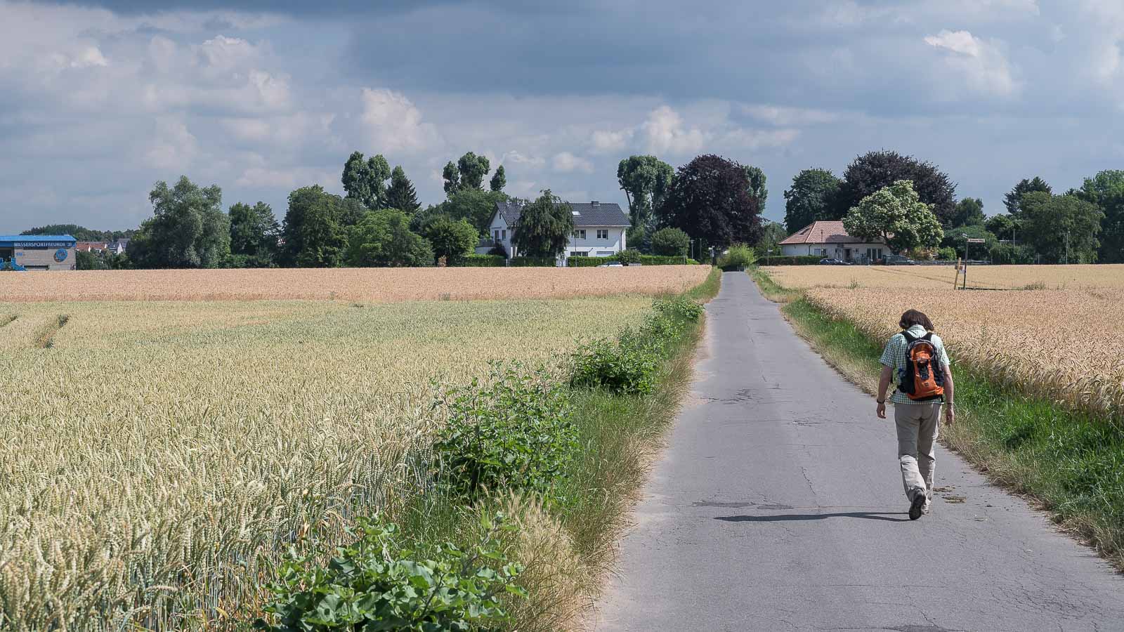 Mein neuer Wanderführer Wanderungen für die Seele: Rhein,Ahr,Erft kam mir daher gerade richtig. Hier werden 20 linksrheinische Wanderungen beschrieben die ich größtenteils noch nicht kannte und die recht viel versprechend ausschauen. Heute wollten wir mit der Nr. 17 starten. Sie beginnt am Ende der Uferstraße in Köln-Rodenkirchen. Also gab ich das bei Google Maps als Ziel ein und wir starteten kurz vor 10 Uhr in Leichlingen. Wir kamen an der Tennisplätzen in Rodenkirchen an, wo die Uferstraße beginnt und durften dort aber nicht weiter fahren. Da hätte ich besser mal vorher auf die Karte nach dem Ziel meiner Navigation geschaut. Macht aber nichts, wir verlängerten die Wanderung so um eine kleine Passage durch Kornfelder bis wir den eigentlichen Startpunkt an einem Minigolfplatz erreichten.