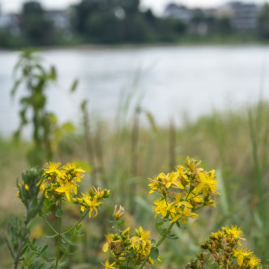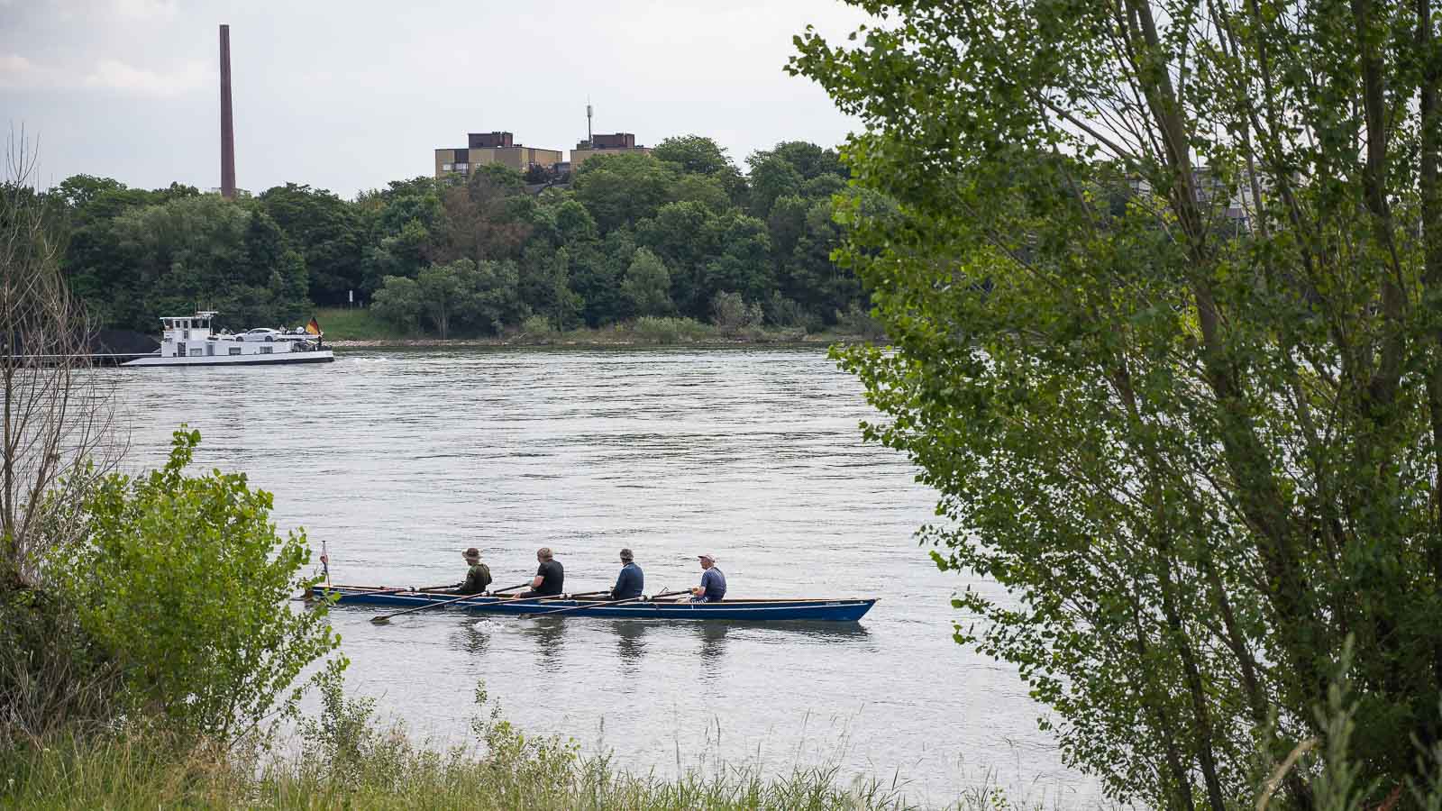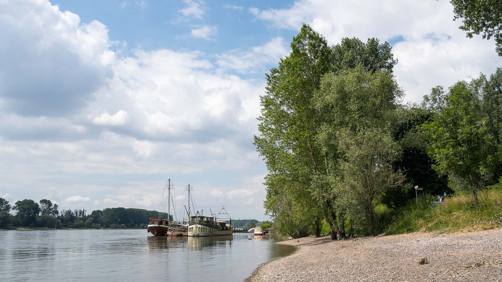 Auf dem Kölnpfad wanderten wir parallel zum Rhein auf einem asphaltiertem Radweg. Gelegentlich machten wir an seitlich abgehenden Trampelpfaden kleine Abstecher an den Rhein um einen Blick auf den Fluss und das gegenüberliegende Porz zu erhaschen. Parallel zu dem Radweg verliefen nach meiner Karte teilweise noch bis zu drei weitere Pfade. Da diese nicht asphaltiert waren, nutzen wir zeitweise einen davon. Die waren aber von Brennnesseln fast zugewachsen, sodaß wir schon bald reumütig auf den ursprünglich Pfad zurück kehrten. Dieser ging auch schon bald direkt am Ufer entlang und bot einen schönen Blick über den Fluss.