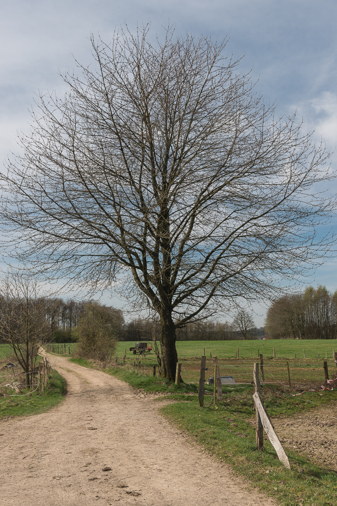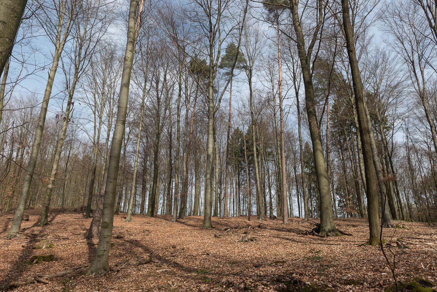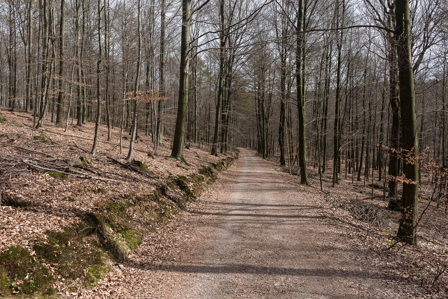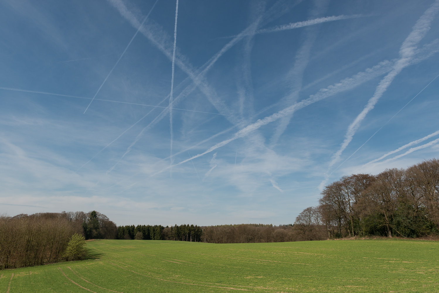 Von nun an ging die Wanderung über offenes Feld mit schöner Aussicht Richtung Remscheid. Nach ca. 2 km ging es wieder mehr durch den Wald. Im Gegensatz zur „Seerunde“ begegneten wir hier nur wenigen Mitwanderern. Eine Reitersfrau und ein Pärchen mit Hund, mehr haben wir nicht gesehen. Im Gegensatz dazu war am blauen Himmel mehr los, die meisten Wolken stammten von Flugzeugen, sehr zerkratzt sah das aus.