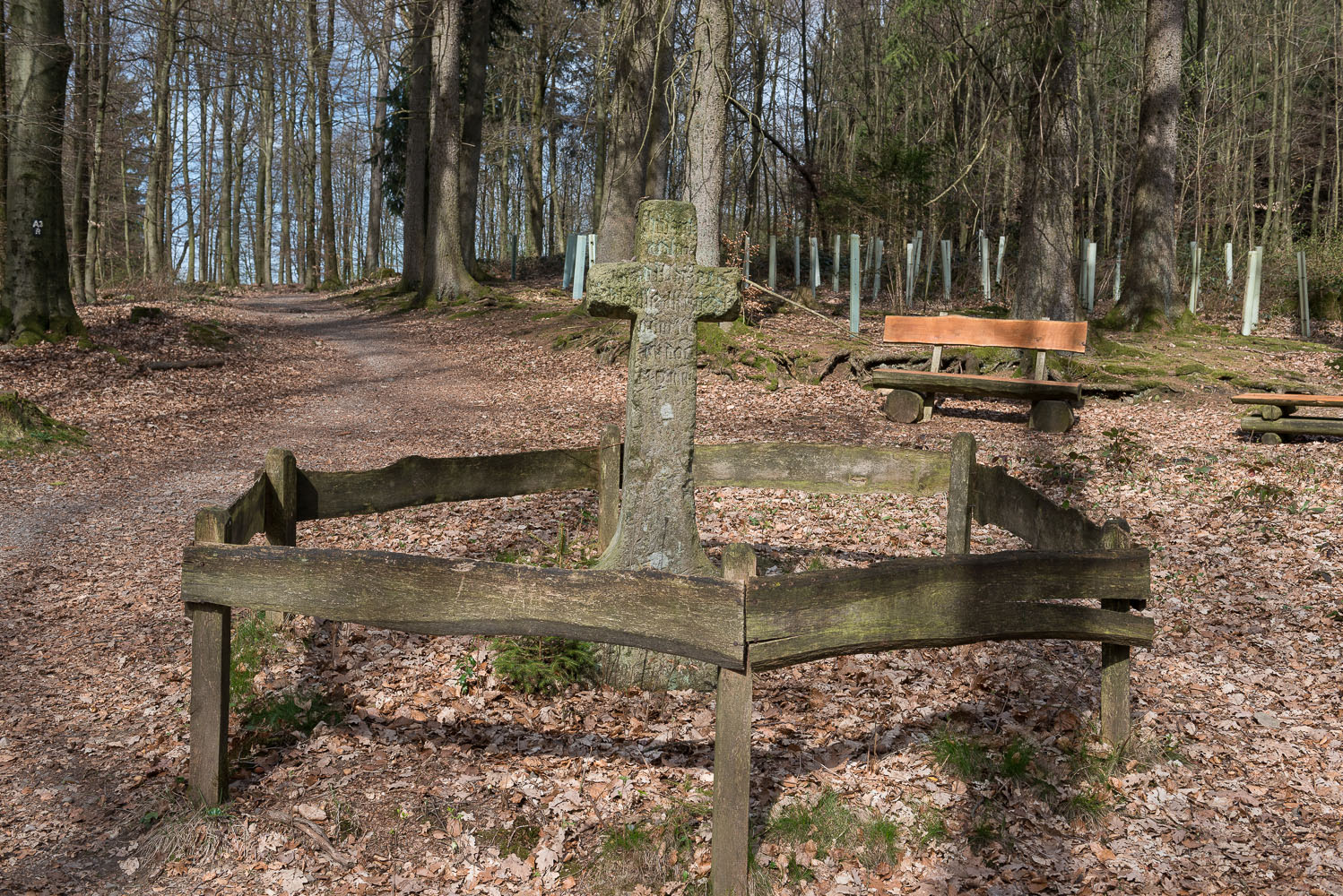 Schon bald verließen wir den Talsperrenrundweg und gingen am Steinernen Kreuz vorbei leicht den Berg hinauf. Das Kreuz erinnert an einen Raubüberfall auf einen Geldboten am 17.Okober 1554. Zur Geschichte des Überfalles gibt es einen Aushang den ich natürlich abphotographieren mußte :