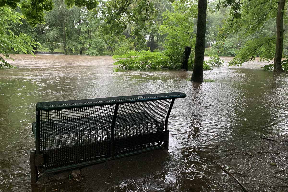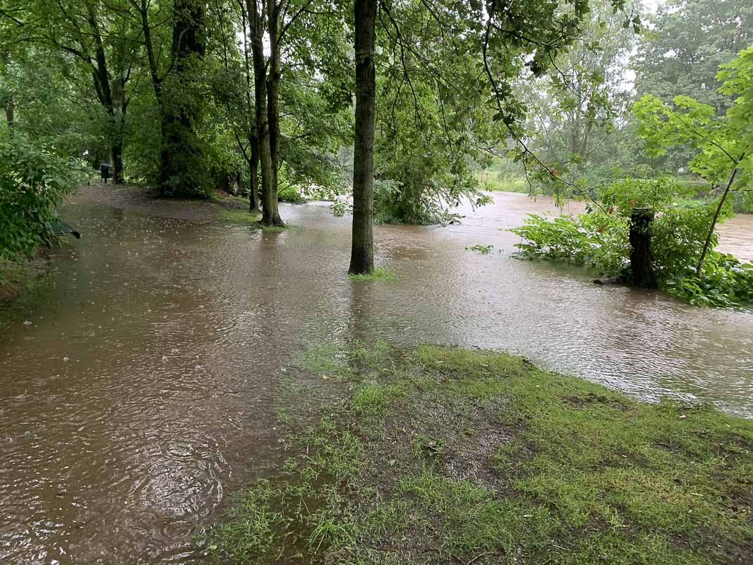 Die letzten Wochen waren wettermäßig gesehen eher feucht und der Fluss führte reichlich Wasser. Ab Montag dem 12. Juli erfolgten Wetterprognosen denen zufolge wegen enormer Regenmengen ein Hochwasser drohte. Am 14. Juli regnete es tagsüber den ganzen Tag Bindfäden und spätnachmittags bewaffnete ich mich mit einem großen Regenschirm und unternahm einen Spaziergang entlang der Wupper. Das Wasser war deutlich angestiegen und hatte zum zweiten Mal innerhalb der letzten Jahre das Gelände der nahegelegenen Paul Klee Schule überflutet. Der Weg auf der gegenüberliegenden Wupper Seite war gerade noch passierbar. Unterwegs machte ich mit dem Handy einige Bilder von den in Richtung Rhein strömenden Wassermassen.