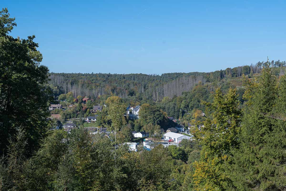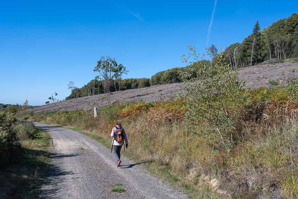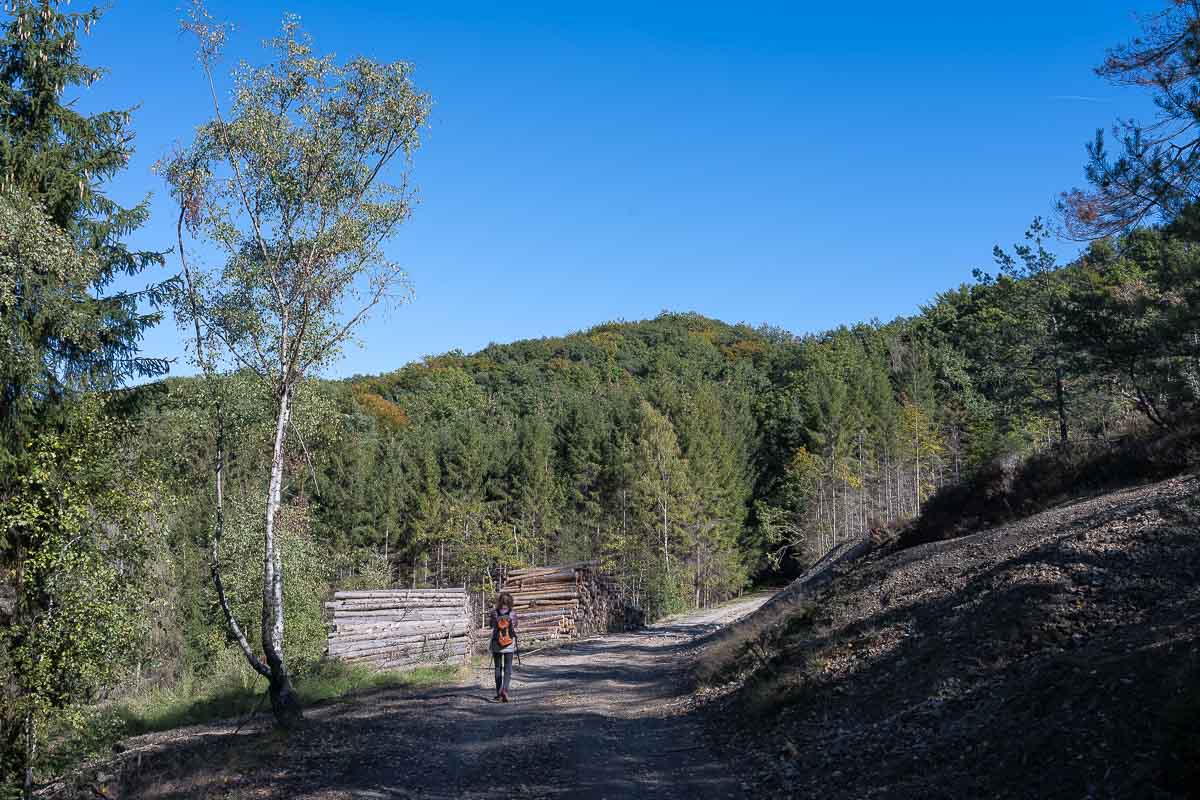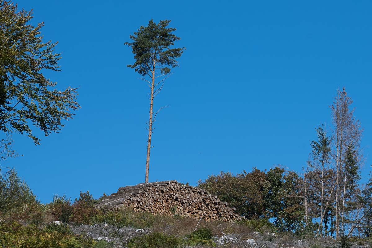 Eigentlich wäre der Weg bis zum erneuten Abstieg zur Sülz durch Waldgebiet verlaufen. Da es mal Nadelwald war ist der fast komplett dem Borkenkäfer zum Opfer gefallen und mußte gerodet werden. Die wenigen Laubbäume sind alle stehen geblieben und von den Nadelbäumen sind nur noch einige vergessene Gerippe übrig geblieben.