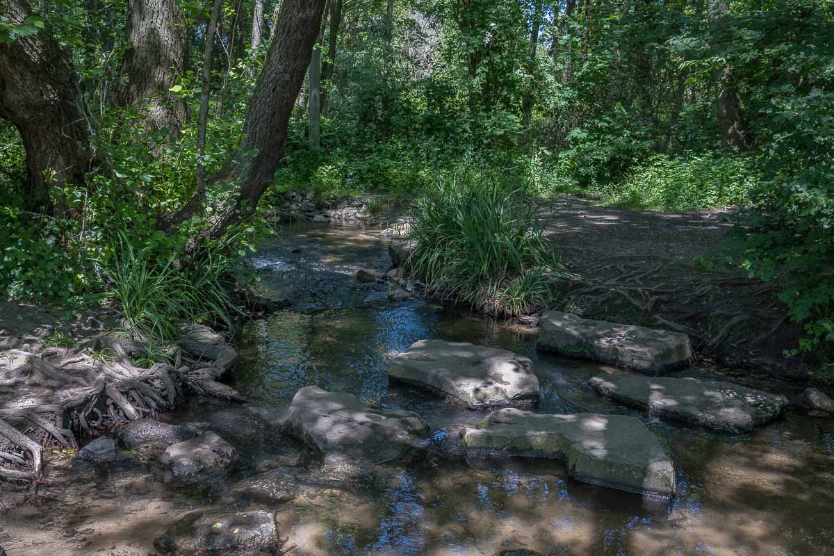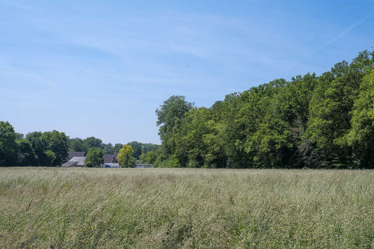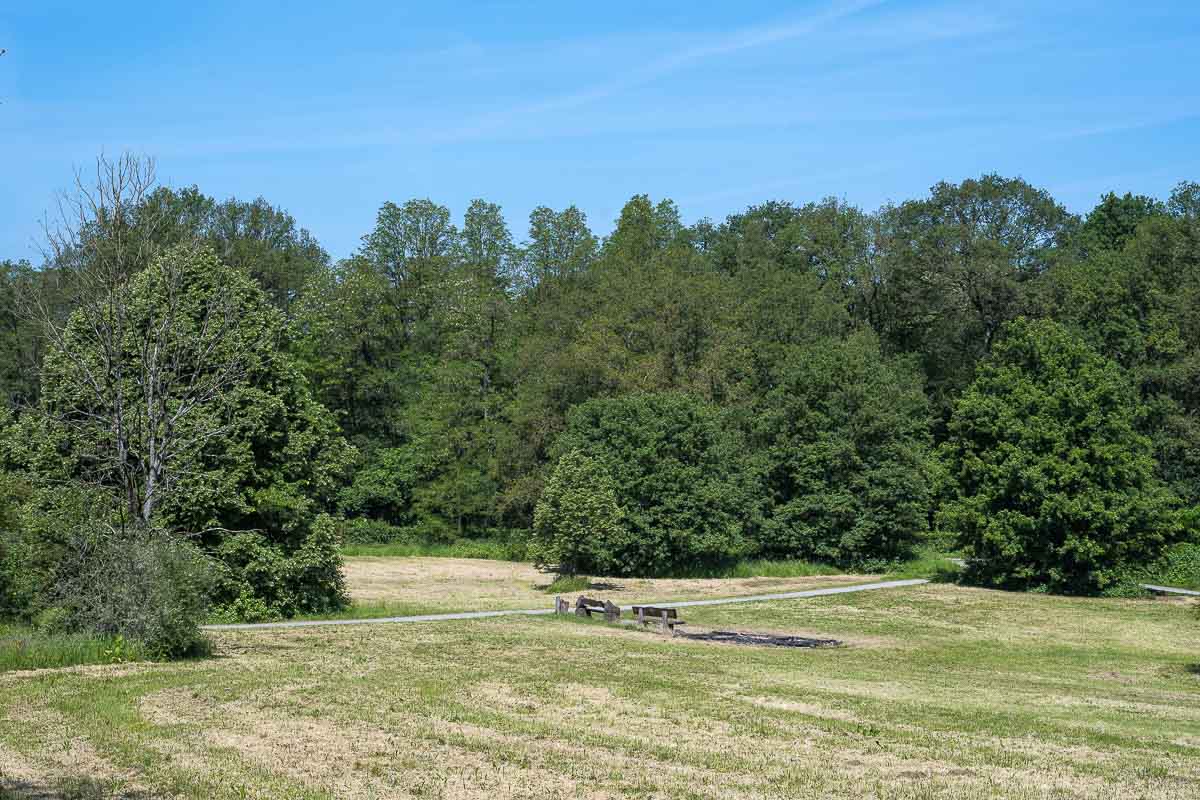 Gegen Ende der See Umrundung machten wir eine kleine Abkürzung und gelangten nach ca. 6 gelaufenen Kilometern an den Wildpark Dünnwald. Das Gelände ist recht groß und machte einen gepflegten Eindruck. Wir wanderten daran vorbei und bekamen nur etwas Damwild aus einiger Entfernung zu sehen. Die folgenden 1 – 2 Kilometer führten überwiegend durch alte Buchenwälder zur Diepeschrather Mühle. Hier gibt es einen großen Pferdehof mit allerlei umliegenden Weideflächen. Die Weideflächen wurden auf weiteren 2 km umrundet (siehe Karte). Am östlichsten Punkt unserer Runde fanden wir eine schöne Bank für unsere Mittagspause und dort verzehrten wir unsere Marschverpflegung.