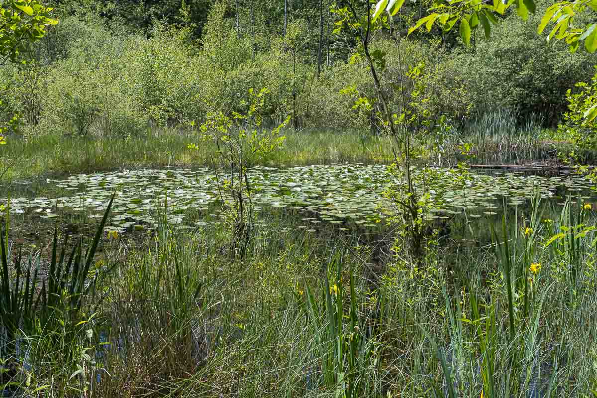 Hinter der Diepeschrather Mühle kamen wir im Wald an einem Teich / Tümpel vorbei, der nicht auf der Karte eingetragen war. Es gab viele Seerosen und Frösche die den Wald mit ihrem Gequake beschallten. Auf einmal sah ich einen Reiher der vorbei geflogen kam. Da war das Gequake plötzlich wie abgestellt. Die Frösche hatten Sendepause und brachten sich wohl erstmal in Sicherheit.