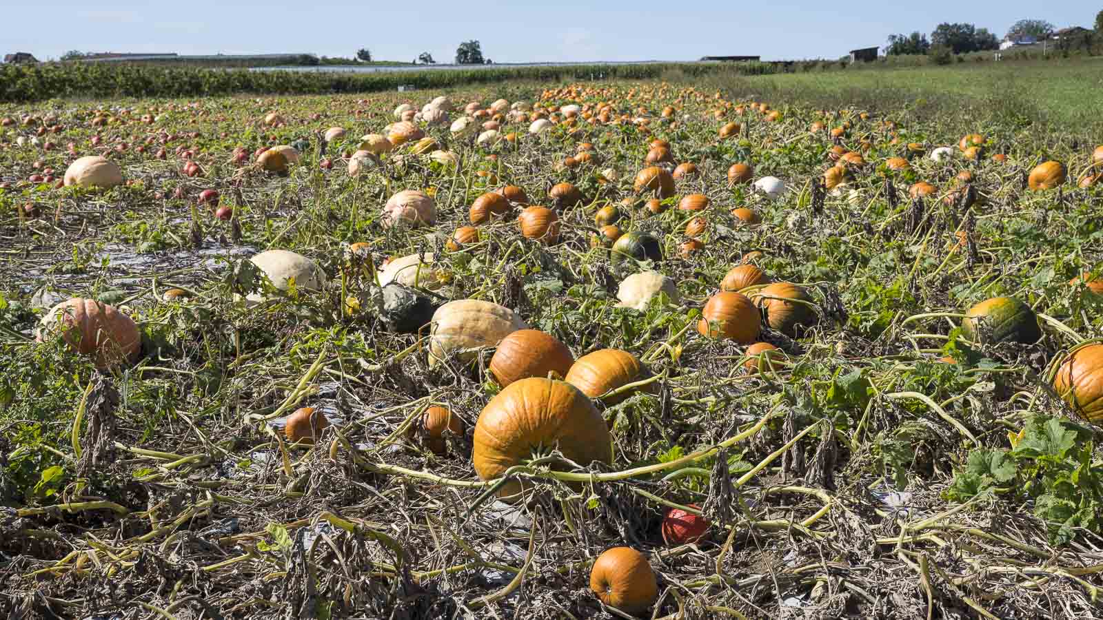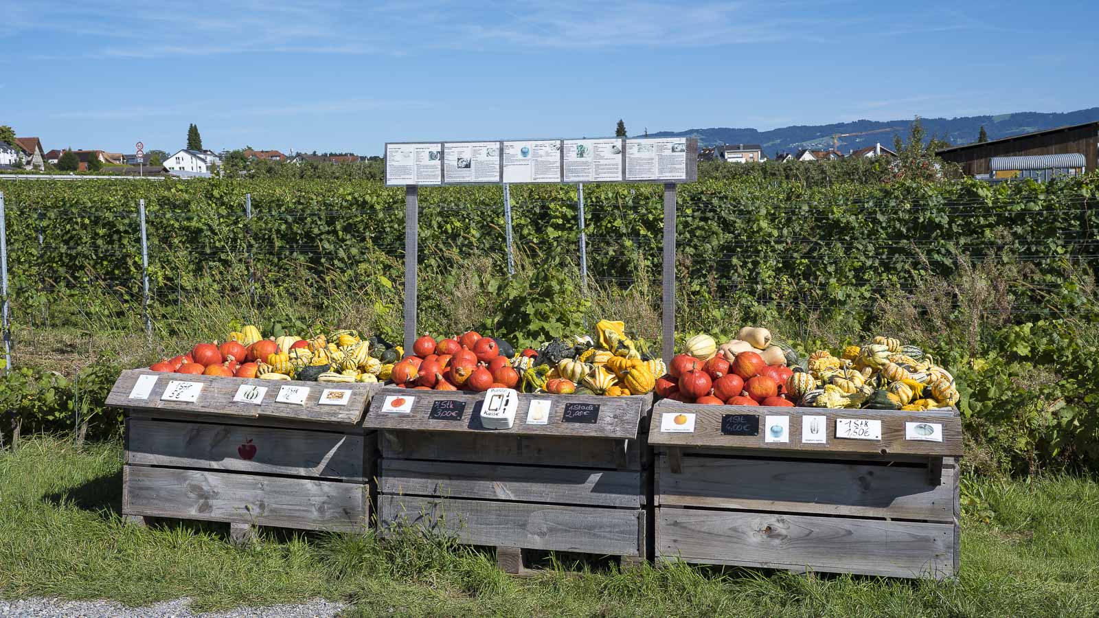 In dem kleinen Örtchen Hattnau hatte ich die Nase voll von dem bescheidenen Track entlang der Landstraße und suchte uns eine Alternativroute zurück nach Nonnenhorn. Diese führte uns auf kaum befahrenen Wirtschaftswegen zu dem Örtchen Hege und von dort zurück zu unserem Ausgangspunkt. Kurz vor Hege Hatten wir noch eine tolle Aussicht über Weinberg und den Bodens bis zu den Schweizer Bergen auf dem gegenüberliegendem Ufer (siehe Beitragsbild). Später kamen wir noch an einem sehenswerten Kürbisacker vorbei. Einige Kilometer weiter wurden die Kürbisse am Straßenrand zu Verkauf angeboten.
