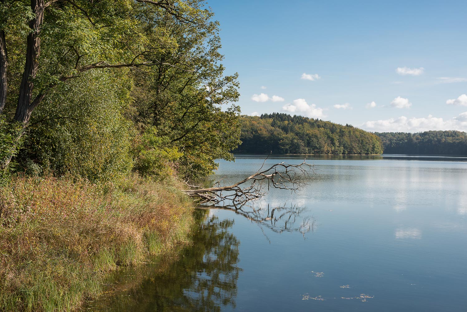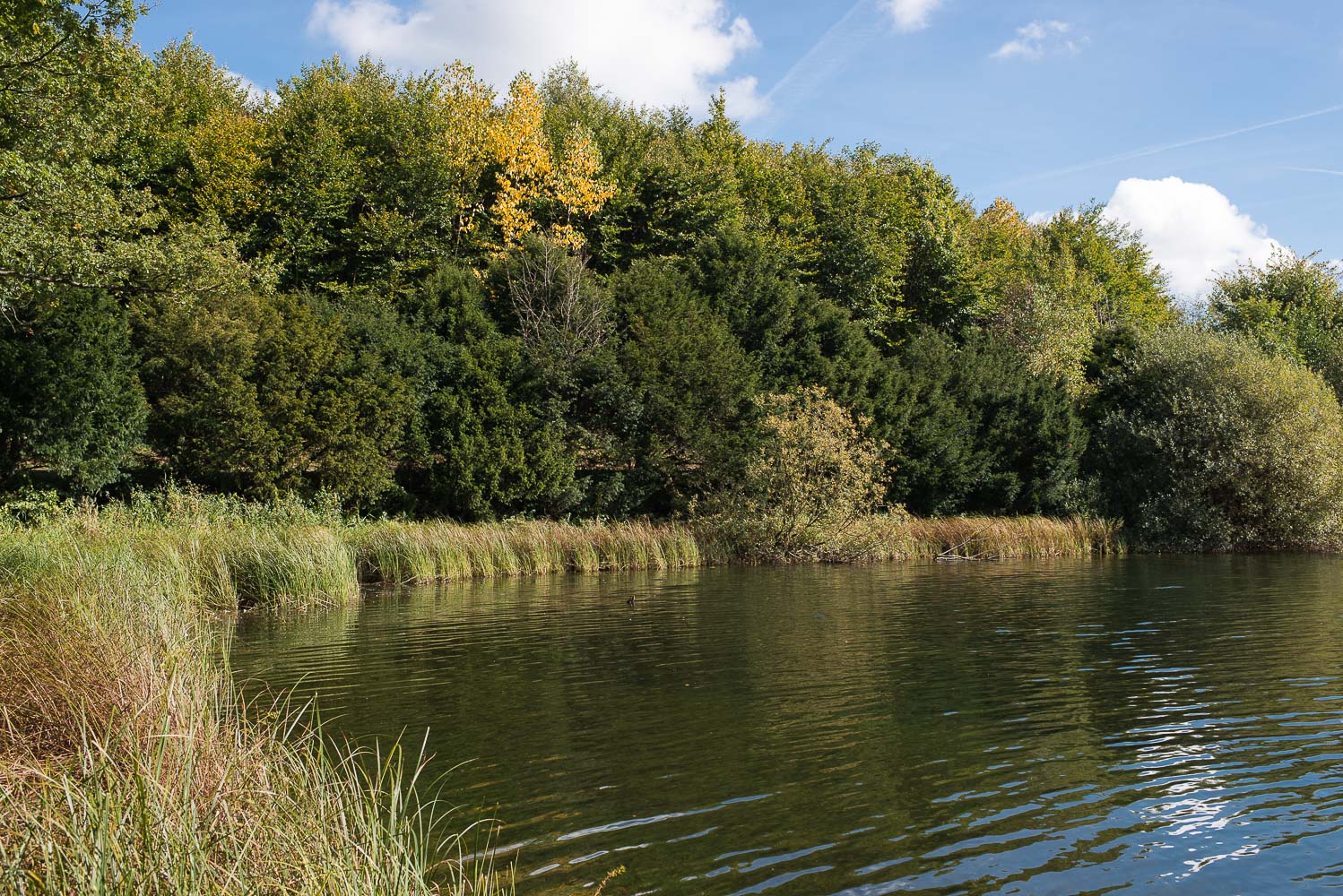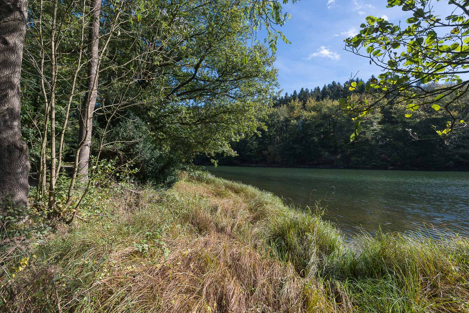 Nach ca. knapp 2 km kam ich bei Großhöhfeld an einem Seitenarm der Bevertalsperre an. Dieser wird auf einem kurzen Damm überquert. Auf der anderen Seite ging es kurz an der Strasse entlang und dann recht ab an einem Teich vorbei und laut Track des Wanderführers in Richtung einer Feriensiedlung. Der Track passte aber nicht und ich stand auf einmal mitten auf einer weglosen Wiese. An einer Seite gab es einen „Ausgang“ der wieder auf den A7 Wanderweg zurückführte. So gelangte ich dann wieder zurück auf den Track der ansonsten o.k. war.
