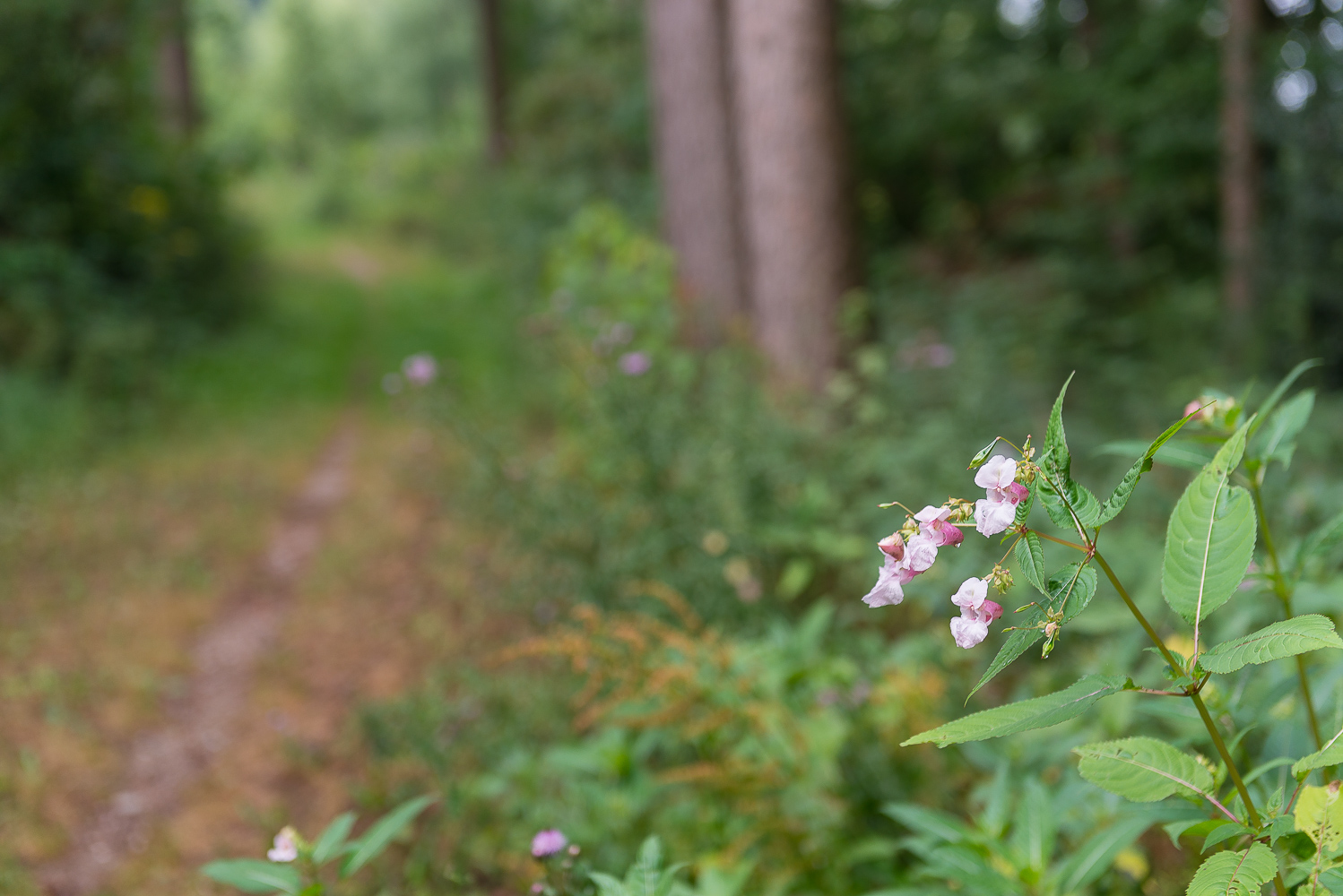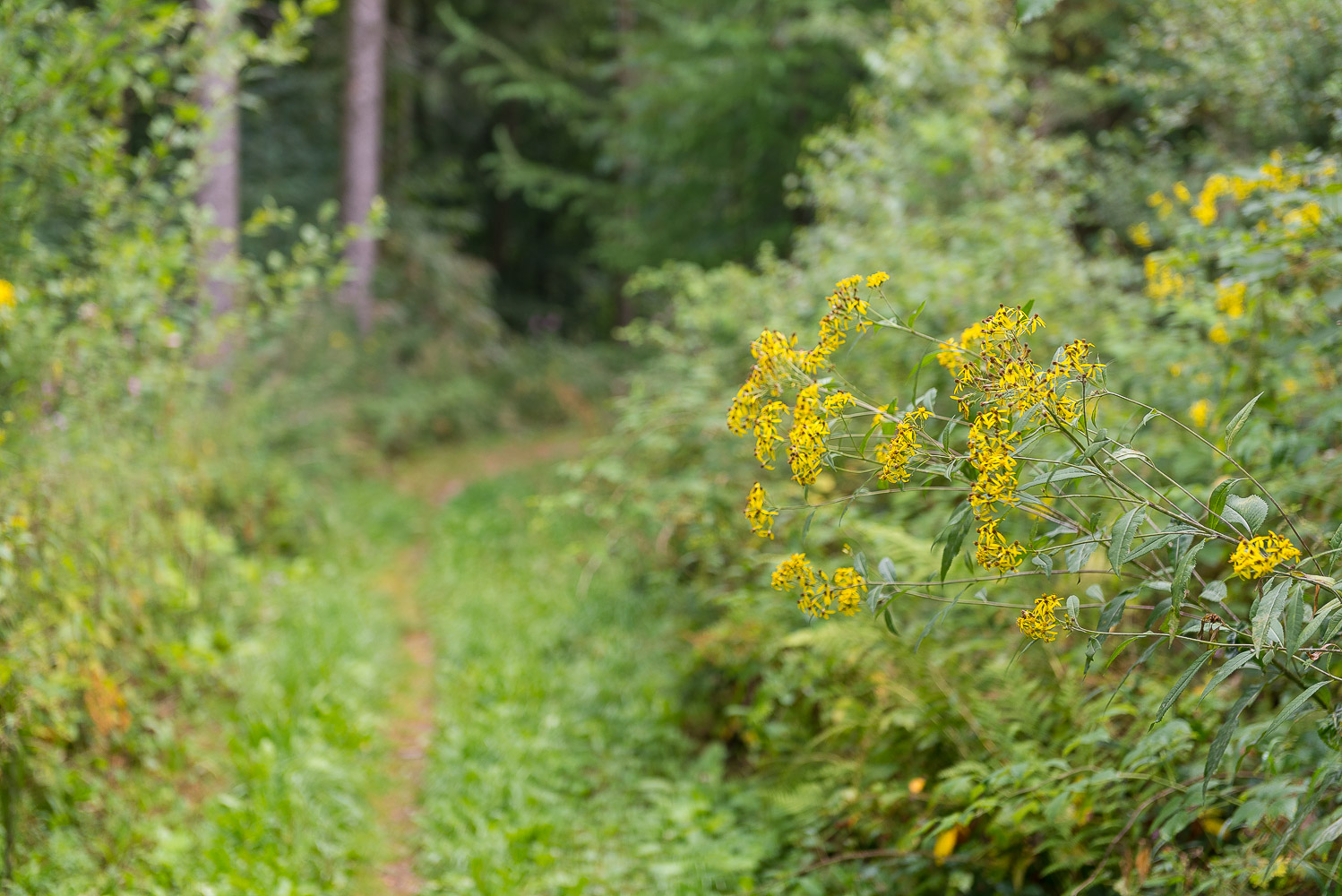 Der Wanderweg verlief auf der dem Parkplatz gegenüberliegenden Strassenseite etwas versteckt. Er folgte für eine ganze Weile dem Wanderweg A7 des Sauerländischen Gebirgsvereines. Es war noch etwas bewölkt und die Sonne kam erst nach 1 ½ Stunden der Wanderung hervor. Ich nutzte das anfänglich gute Licht für einige Bilder. Insbesondere die Blüten am Wegesrand hatten es mir wieder einmal angetan :