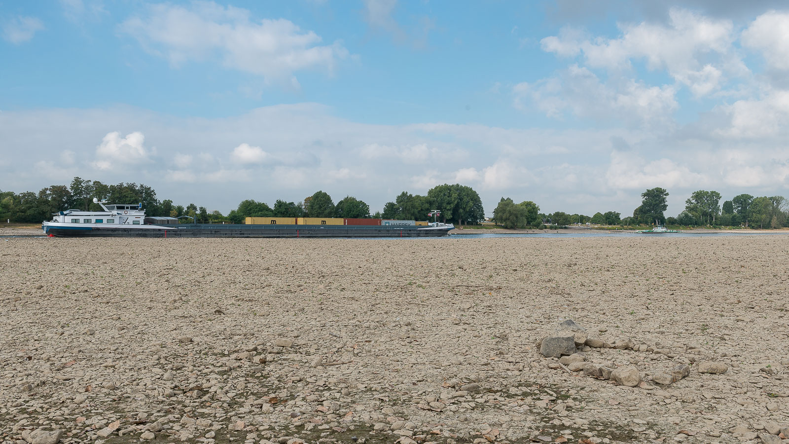 An der Spitze der Halbinsel (Kemper Werth) konnte man das Ausmaß der derzeitigen Trockenheit am besten erkennen. Ich wanderte weiter bis zur derzeitigen Einmündung der Sieg in der Rhein. Nach der Karte meines Navis (siehe beiliegenden Track) befand ich mich schon lange mitten im Fluss und hätte eigentlich nasse Füsse bekommen müssen. Auch die Schifffahrt auf dem Rhein war stark beeinträchtigt : weniger Verkehr und alle Schiffe halb leer.