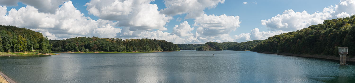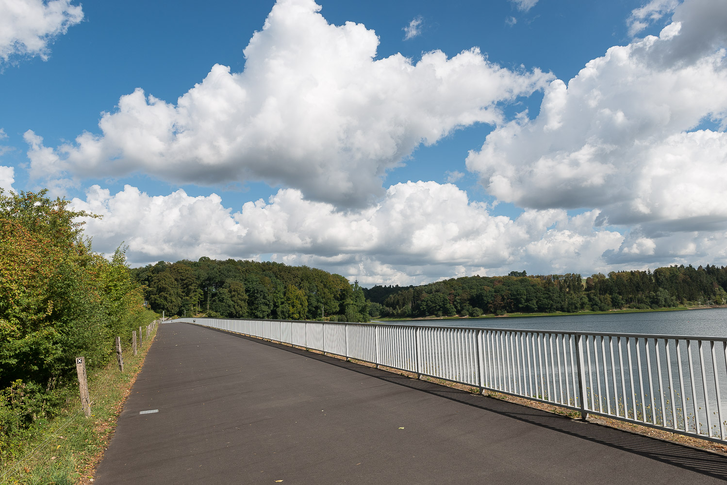 Nach ca. 3,5 km kam ich unten im Tal an. Dort liegt das ehemalige Franziskanerkloster Seligenthal. Es wurde 1803 aufgelöst, heute befindet sich dort ein Event-Hotel. Die Anlage wurde auf einem Sträßchen umrundet und danach ging es über den Wahnbach. Auf der anderen Seite begann der Aufstieg zur Talsperre. Dieser ist am Ende recht steil und dürfte im Winter oder bei matschigem Wetter zumindest für mich nicht mehr begehbar sein. Es gibt aber die Möglichkeit einen kleinen Umweg über einen breiten Waldweg zu machen. Oben angekommen wird man durch einen tollen Ausblick über den Stausee belohnt :