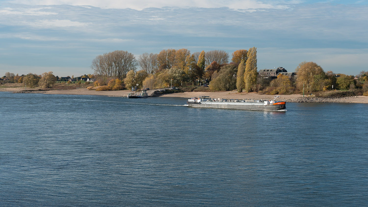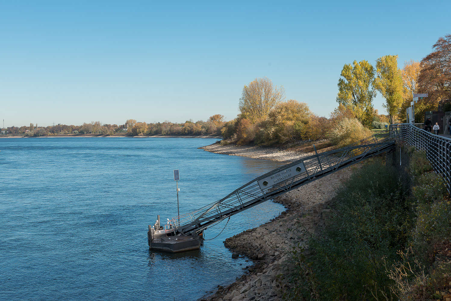 Der Rhein ist hier deutlich breiter als ich es von Köln oder gar von Neuwied her gewohnt bin. Auf den ersten Blick fiel mir daher der niedrige Wasserstand gar nicht so sehr auf. Erst der tief hängende Anlieger der Köln-Düsseldorfer Schifffahrtsgesellschaft zeigt mir, wie wenig Wasser im Rhein war. Es fuhren zwar viele Schiffe den Fluß rauf und runter, aber die sahen alle recht leer aus und hatten kaum Tiefgang.