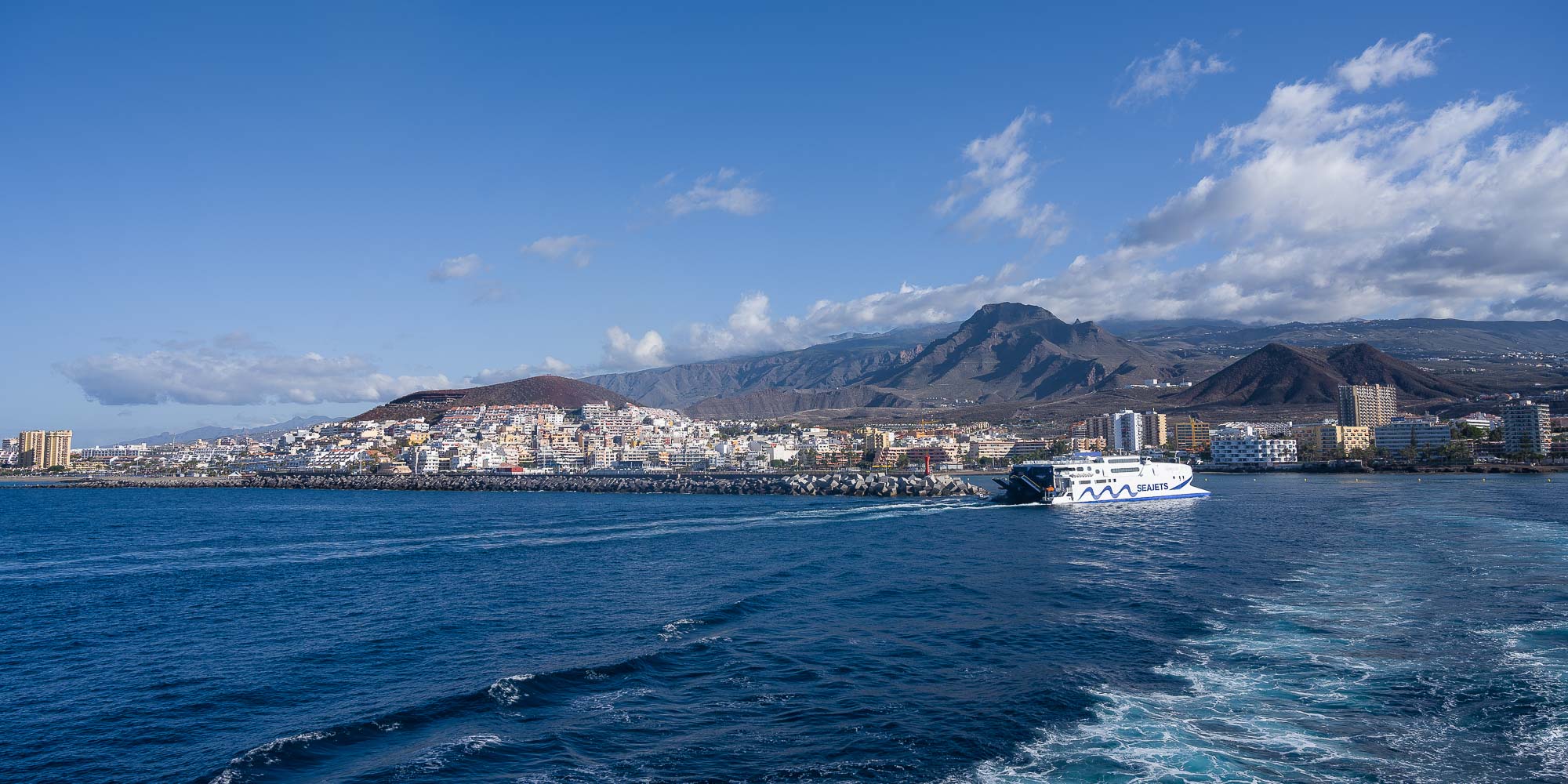 Es wurde ein langer Tag. Um 4 Uhr standen wir auf, im Hotel gab es ein verkürztes, frühes Frühstück und um 5 Uhr wurden wir von einem Bus abgeholt. Da wir nicht die Einzigen waren, fuhr der Bus erstmal einige weitere Hotels ab bevor er sich auf den Weg nach Los Cristianos auf der Südseite der Insel aufmachte. Um etwa 10 Uhr startete von dort unsere Fähre nach La Gomera. Die Überfahrt war ruhig und wir hatten vom Schiff aus eine schöne Aussicht aufs Meer und die beiden Inseln.