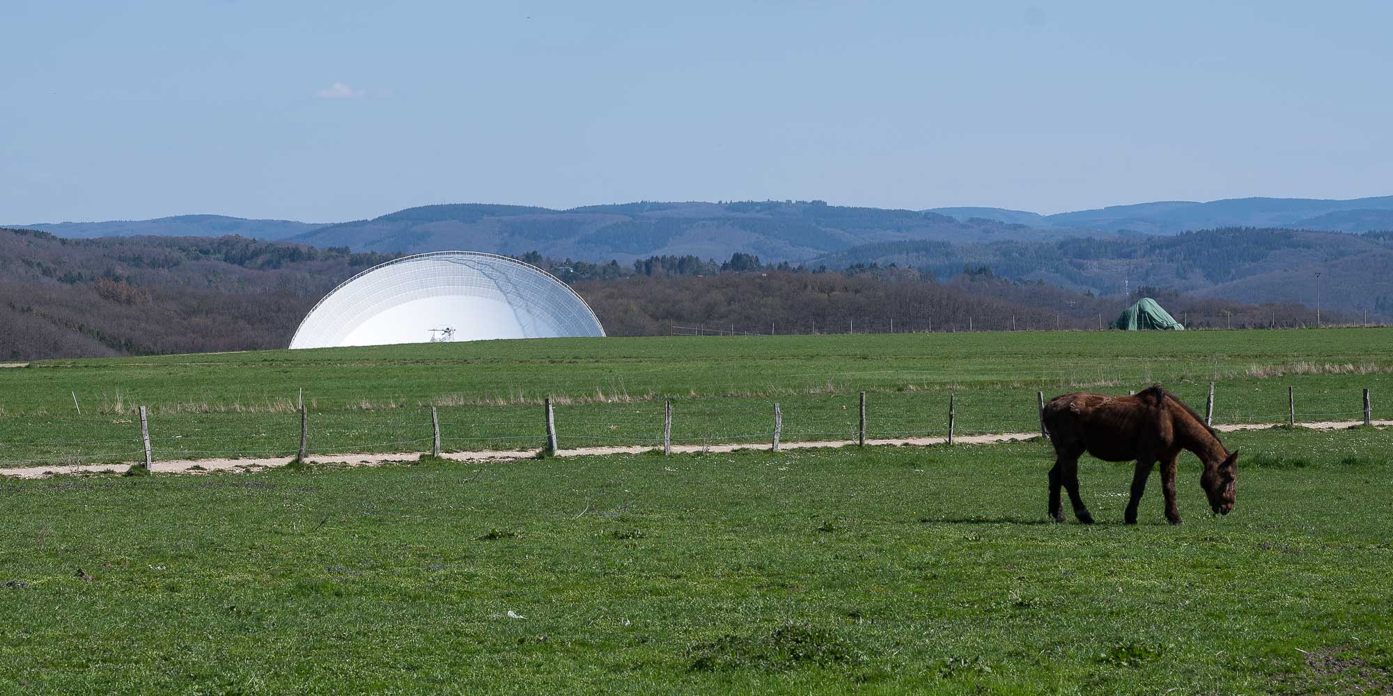 Schon 50 m hinter dem Parkplatz kommt ein Imbissstand der ein vielversprechendes 3 Gänge Menü anbot. Das wäre das was für den Rückweg und wurde entsprechend vorgemerkt. Schon bald kam das Teleskop in unser Blickfeld. Für ein besseres Foto machten wir einen kleinen Seitenabstecher (siehe Track) auf eine Wiese.