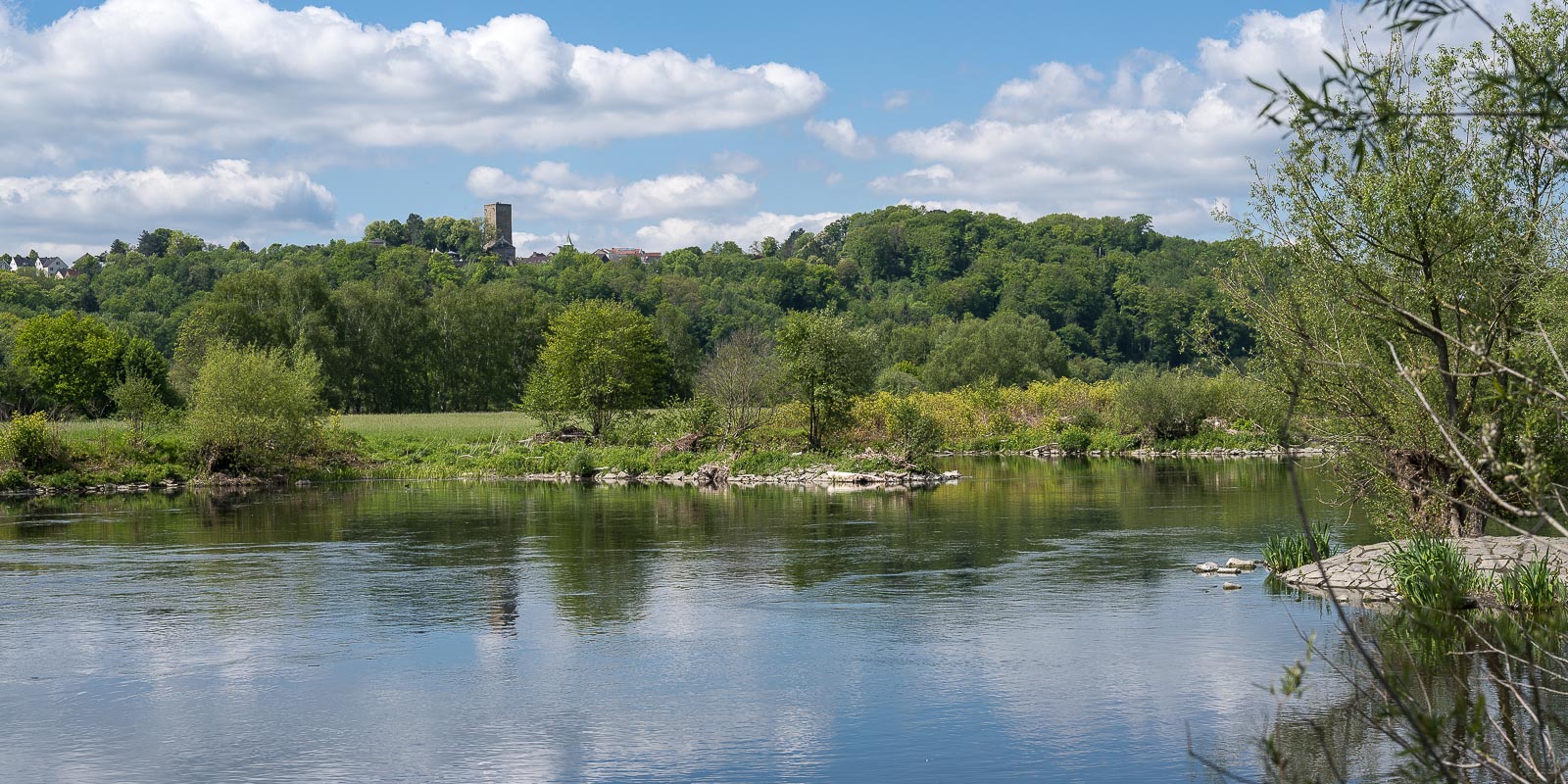 Nach ca. 3 km durch den Wald mit einigem auf und ab kamen wir nach Blankenstein. Ein schönes kleines Örtchen mit vielen Fachwerkhäusern und der Burg als Blickfang mitten drin. Eigentlich wollten wir auch die Burg besichtigen und den Turm besteigen. Petra kannte die Burg noch von „früher“ weil da regelmäßig am Sonntag Jazzkonzerte statt fanden. Bei unserem Besuch herrschte dort ein ziemlicher Andrang wegen eines Events zu dem pro Person 10 Euro Eintritt verlangt wurden. Da uns nicht nach Ritter und Piratenfest zumute war, wanderten wir einfach weiter.
