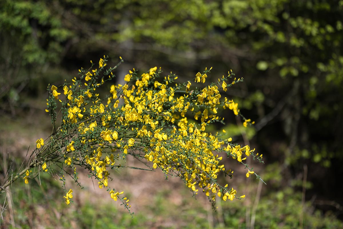 Die breiten Waldwege waren alle naturbelassen und offensichtlich nur wenig begangen. Die Streckenführung ist sehr schön gewählt, sie führt oft am Waldrand entlang mit schönen Aussichten über das Wildenburger Land. An vielen Stellen begann der Ginster zu blühen, was ich natürlich auch im Bild festhalten mußte.