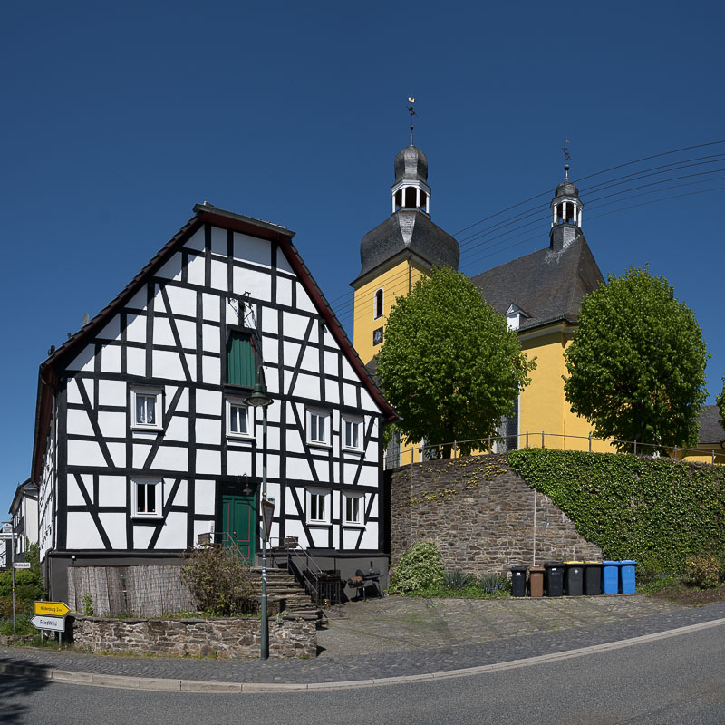Nach der Wildenburg ging es noch durch den gleichnamigen Ort hindurch der aber nur aus wenigen Häusern bestand. Hinter der Hofschaft Ziegenschlade kam ich dann noch an einer schönen Kapelle vorbei. Dabei konnte ich schon in der Ferne den Ort Friesenhagen ausmachen den ich dann auch bald erreichte. Dort umrundete ich eine gelbe Barockkirche mit meiner Kamera ohne eine optimale Perspektive zu finden. Der Ort an sich ist zwar etwas grösser, machte aber eher einen toten Eindruck. Bis auf einige Autos die mir begegneten war da nicht viel los. Die Wagen hatten Kennzeichen AK was mich daran erinnerte, daß ich mich hier schon in Rheinland-Pfalz (Kreis Altenkirchen) befand.