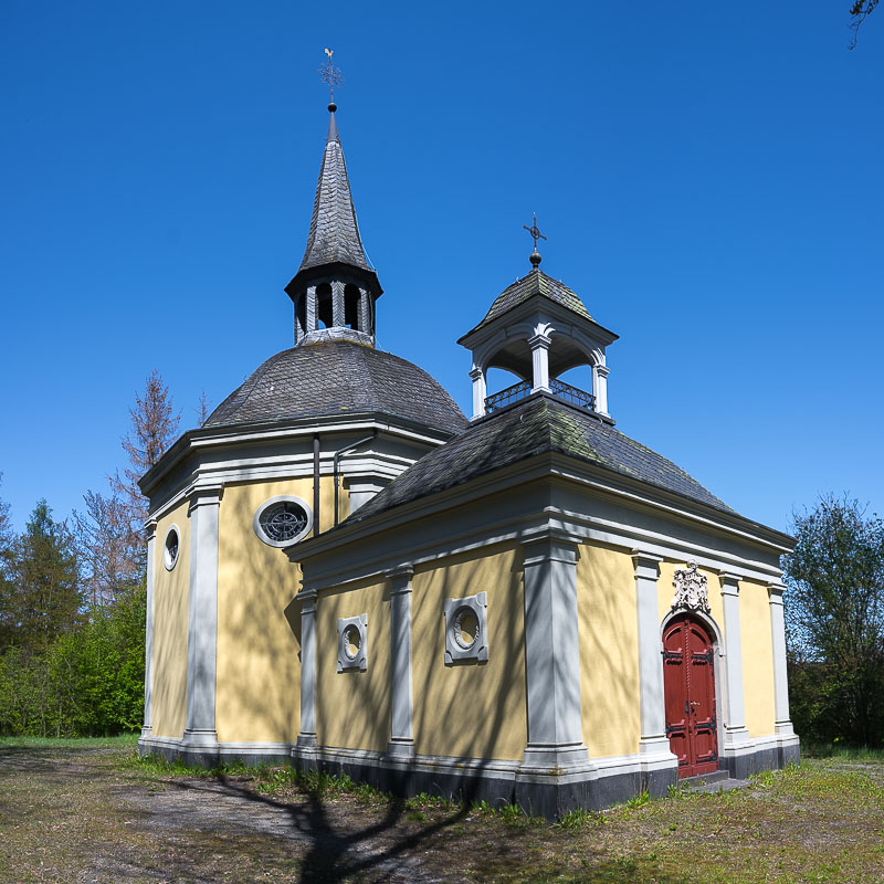 Hinter Friesenhagen wanderte ich wieder mal in den Wald hinein, leicht bergauf. Oben auf dem Hügel angekommen bestaunte ich eine schön erhaltene, alte Kapelle die vor etwa 200 Jahren von einer Gräfin des Wasserschlosses gespendet worden war. Danach ging es bergab zum Schloss Crottorf, von dem ich nur einen Blick durch einen Zaun und zwischen vielen Bäumen hindurch erhaschen konnte. Nach der Überquerung des Wildenbaches (der den Schlossteich speist) lief ich über eine Wiese zurück zur Strasse und zu meinem Parkplatz.