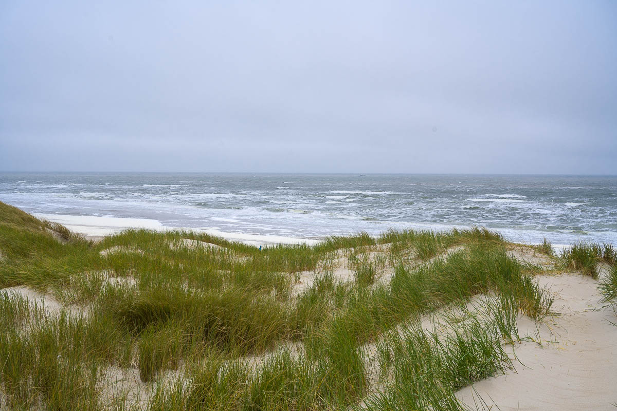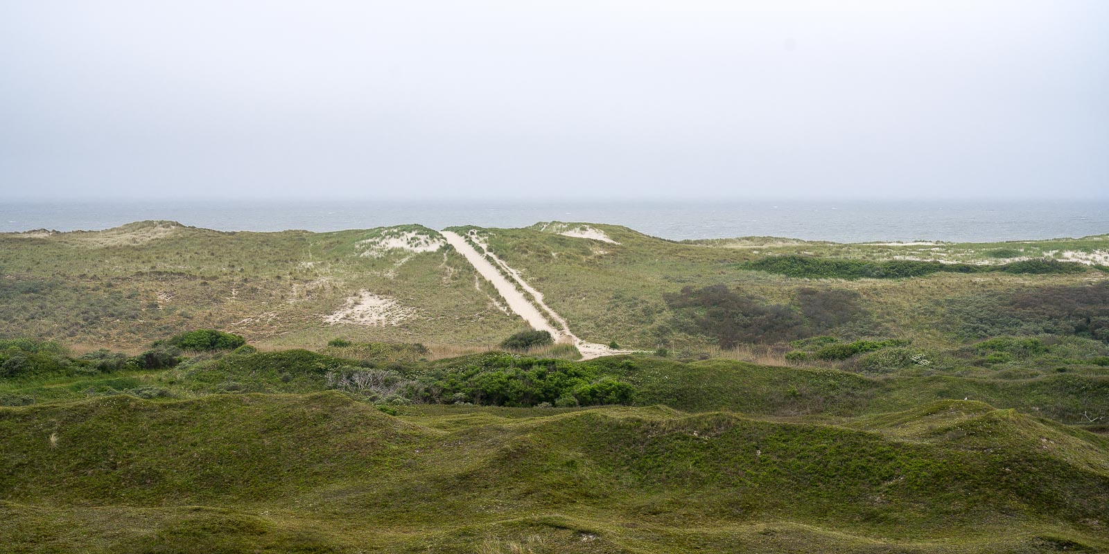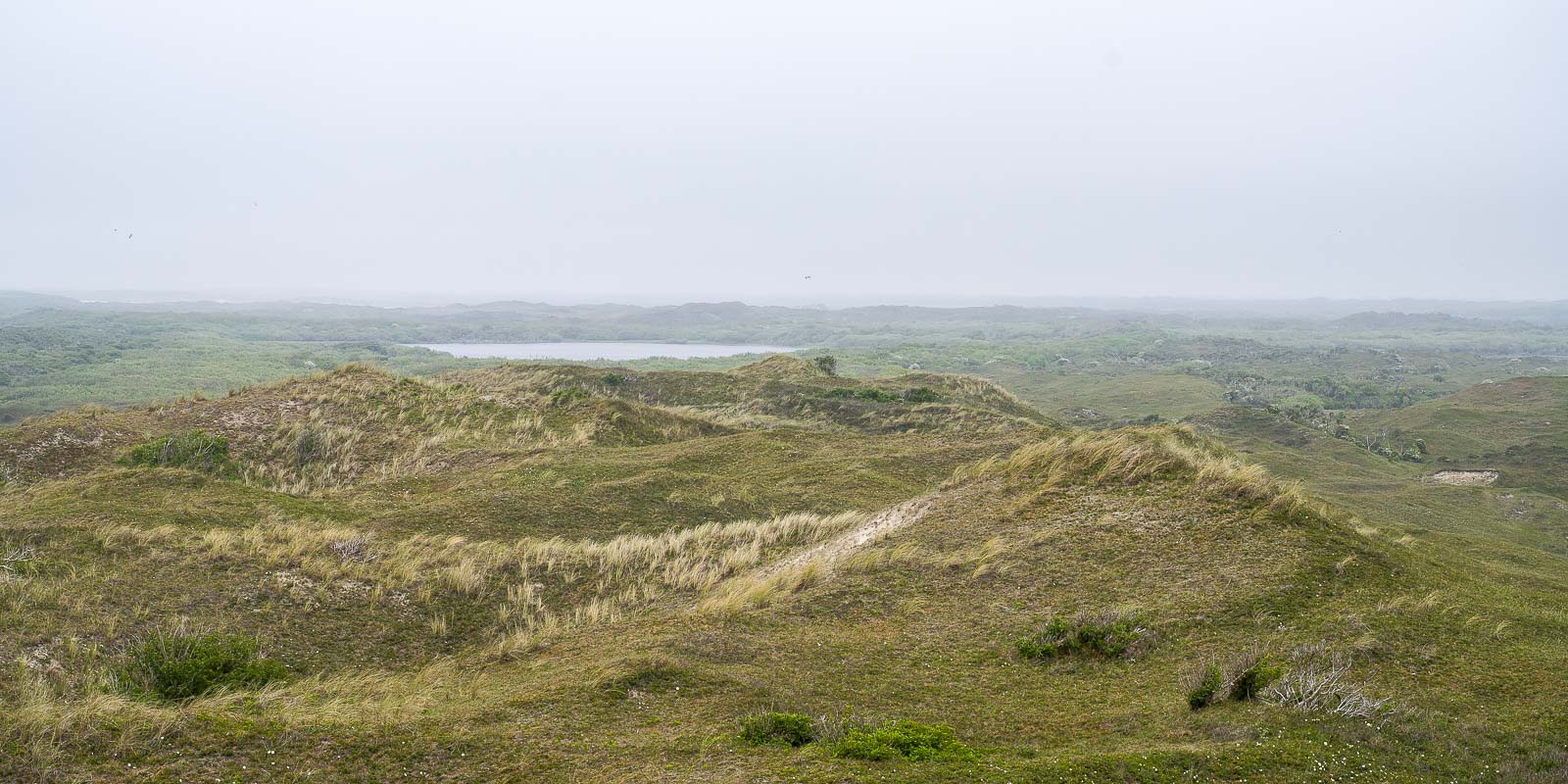 Vom Hotel aus ging es gleich in den gegenüberliegenden Wald. Nach kurzer Waldwanderung erreichten wir den Zufahrtsweg zum Strand. Bevor wir diesen erreichten, bogen wir rechts ab in die Dünen. Eigentlich wollten wir bis kurz vor dem Naturschutzgebiet De Slufter hinter den Dünen lang laufen. Wegen der Brutzeit war jedoch ein Teil des Weges gesperrt, so daß wir rechts ab auf einen Alternativweg abbogen. Dabei kamen wir an einem Aussichtspunkt vorbei, der auf der höchsten Düne lag. Natürlich wurde der erklommen. Wegen des bedeckten bis trüben Wetters war der Ausblick aber nur mäßig.