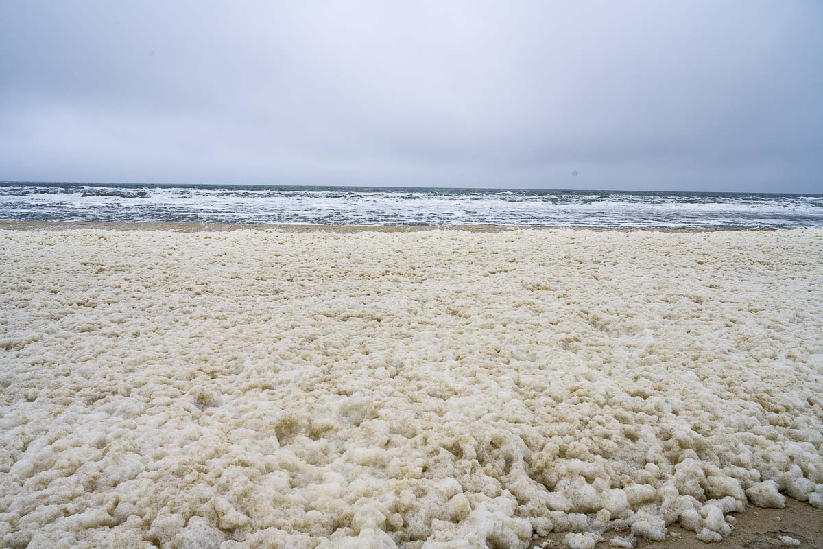 Am Strand wurde es ziemlich windig. Der Wind erzeugte eine starke Gischt die sich dann am Strand als Meeresschaum ablagerte. Dadurch waren wir gezwungen in einiger Entfernung zum Wasser entlang zu laufen. Hier war der Boden trocken und gab bei jedem Schritt nach, so daß unser Vorankommen doch recht mühsam war. Wir sahen einige Wanderer die durch den Meeresschaum auf dem dort festeren Boden liefen, was uns aber nicht ganz geheuer war.