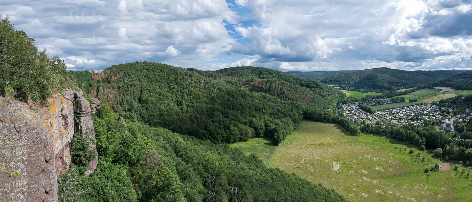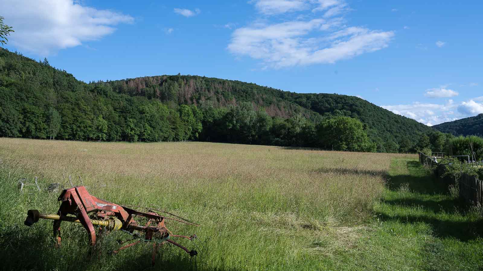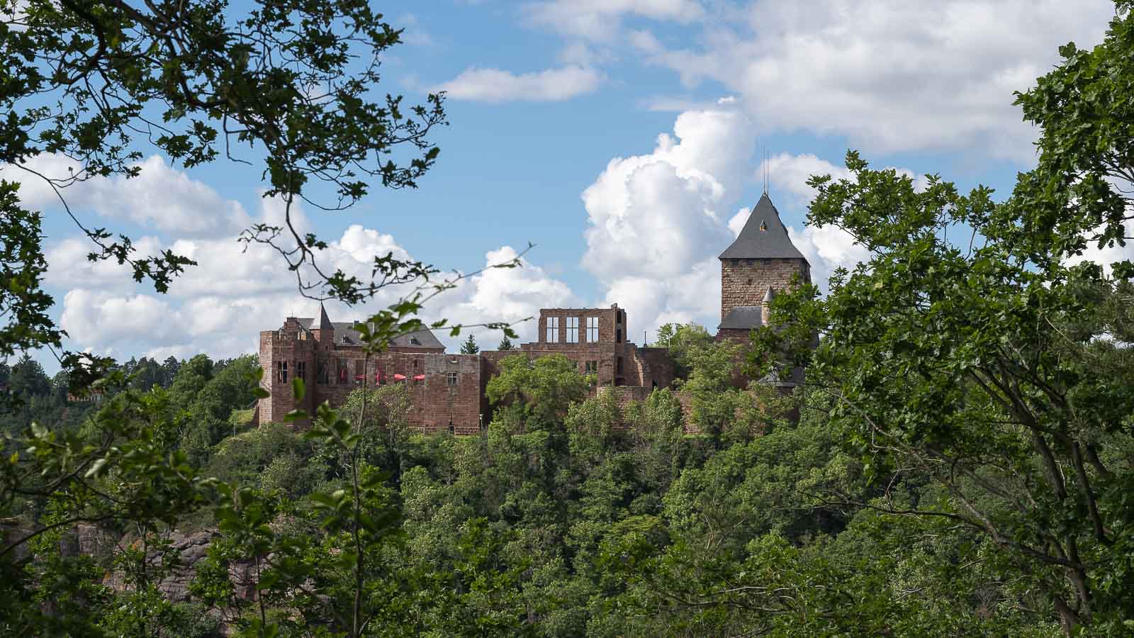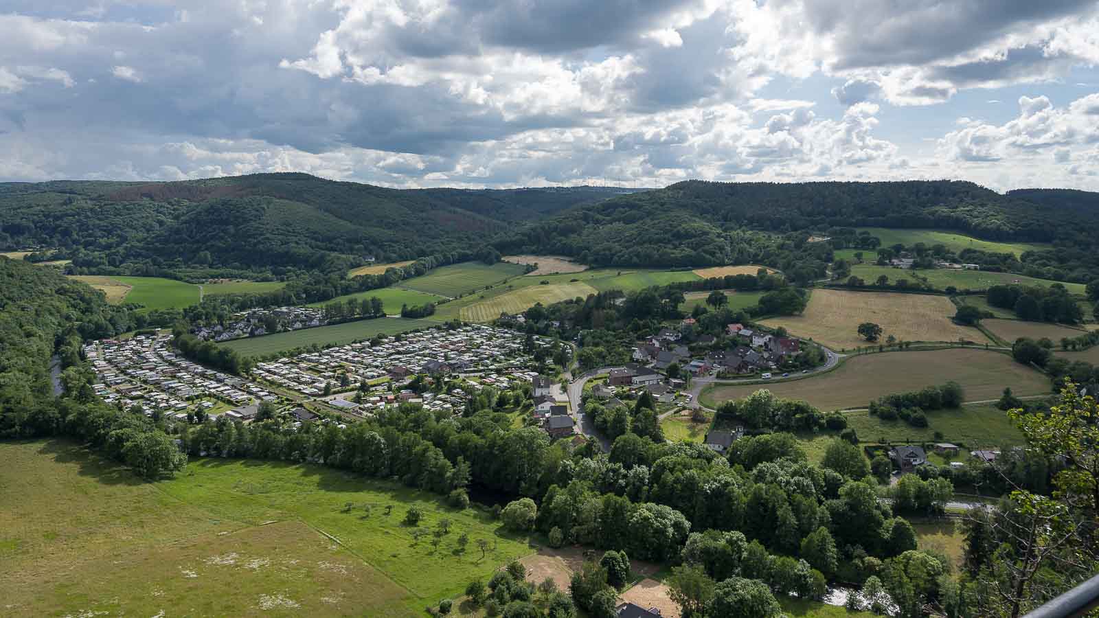 Unten angekommen, wurde es dann wieder einfacher. Wir blieben auf einem Weg der im Tal meist am Waldrand entlang zurück nach Abenden führte. Unterwegs konnten wir an einer Stelle noch die Burg von unten betrachten.