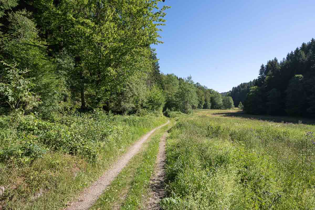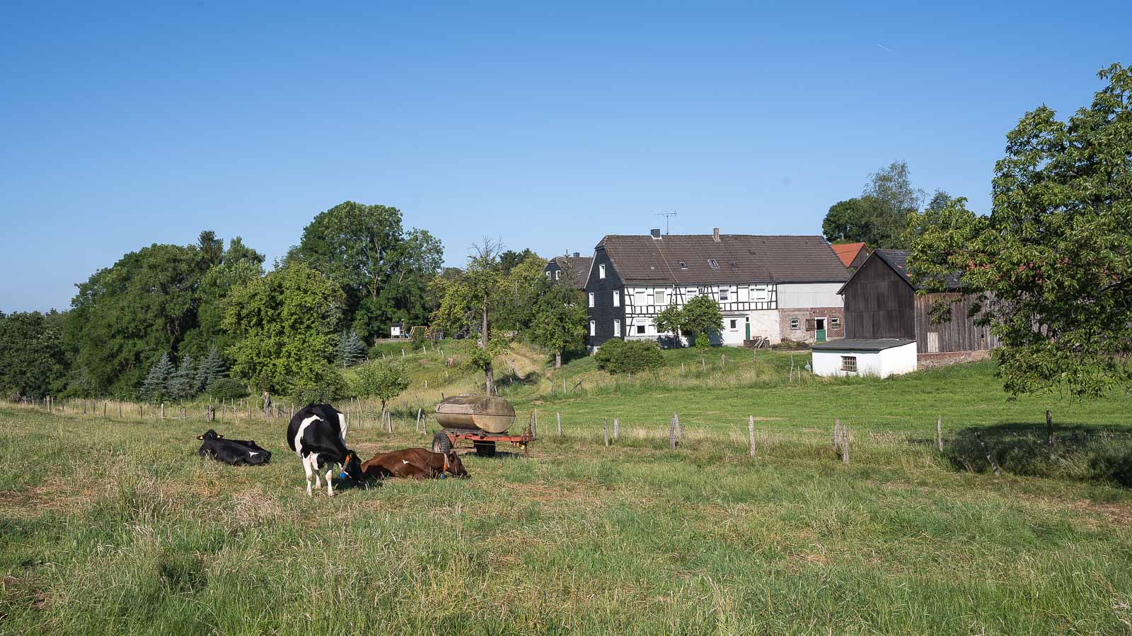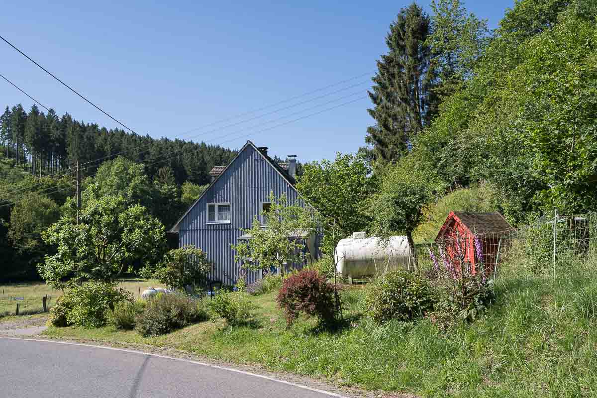 Kurz vor der Knochenmühle bog der Weg scharf rechts ab zu dem Steodterbach. Aus dessem Bachtal ging es wieder langsam bergauf und es wurden mehrere kleinere Weiler passiert. Hier war nichts los, es begegneten mir keine Wanderer, Fussgänger oder ähnliches. Die einzigen Menschenseelen die ich zu Gesicht bekam saßen in Blechkisten mit 4 Rädern dran, waren meist weiblich und fuhren ihren Nachwuchs zu Schule.