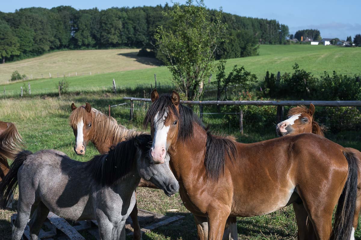 Die Gegend ist landwirtschaftlich geprägt, üblicherweise werden Kühen gehalten, aber auch an einigen Pferdekoppeln kam ich vorbei. Natürlich mussten beide fotografiert werden. Der letzte Teil der Wanderung hinter Bochem / Großkatern ging dann wieder durch das Purder Bachtal zurück nach Purd.
