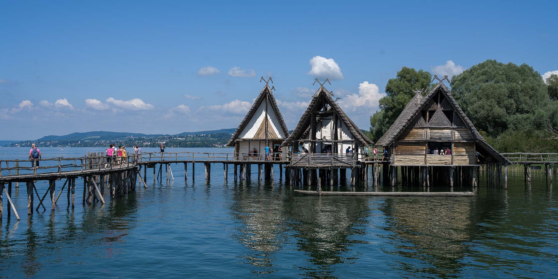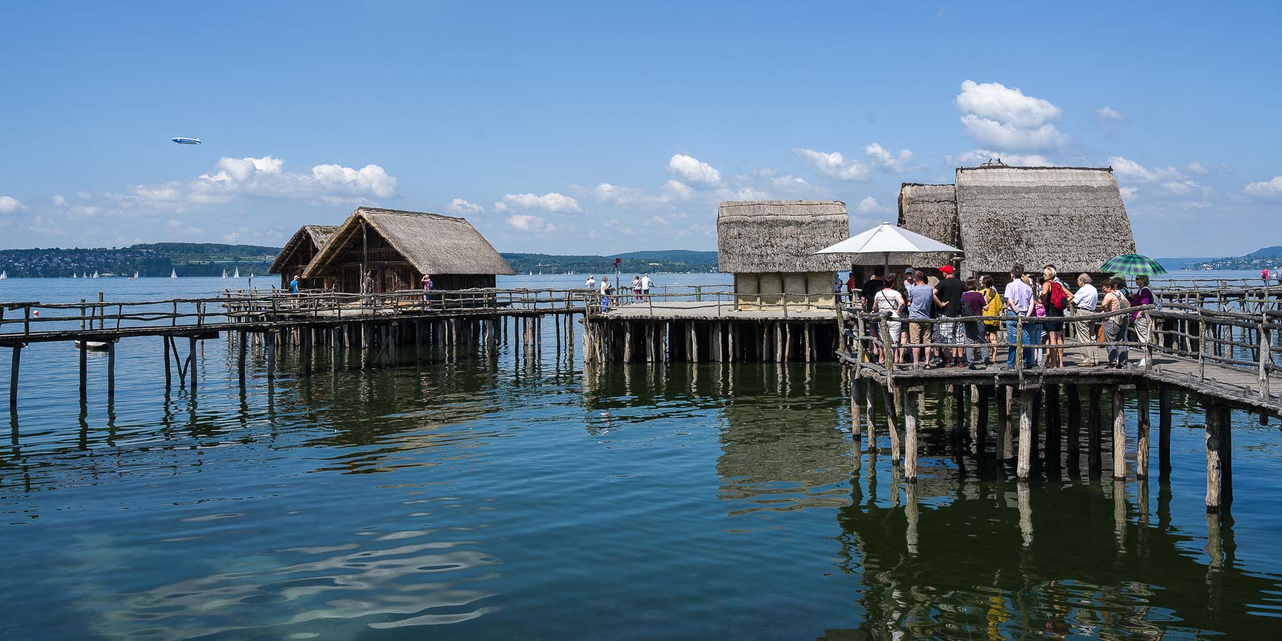 Die Pfahlbauten wurden ab 1922 als Freilichtmuseum aufgebaut. In 2011 wurden sie in das UNESCO Kulturerbe aufgenommen. Jährlich gibt es hier ca. 300 000 Besucher. In diesem Jahr waren Petra und ich 2 davon. Zu Beginn hieß es erst mal anstellen und warten. Dann kam eine Multi-Media-Video und was weiss ich nicht was für eine Show. Danach erfolgte der Einlass mit einer kleinen Einführung. Anschließend durften wir frei herum laufen und die Bauten und darin dargestellten Exponate anschauen. Dabei habe ich mich manchmal schon gefragt was denn da wirklich exakt nachgewiesen wurde und was der Phantasie der Erbauer des Museumsdorfes entsprungen ist. Nun denn, am meisten hatten mich sowieso die Bauten von außen und ihr tolle Lage am See beeindruckt. Was die Auswahl einer Immobilie nach Lage anging hatten die Steinzeitleute schon einen guten Geschmack.