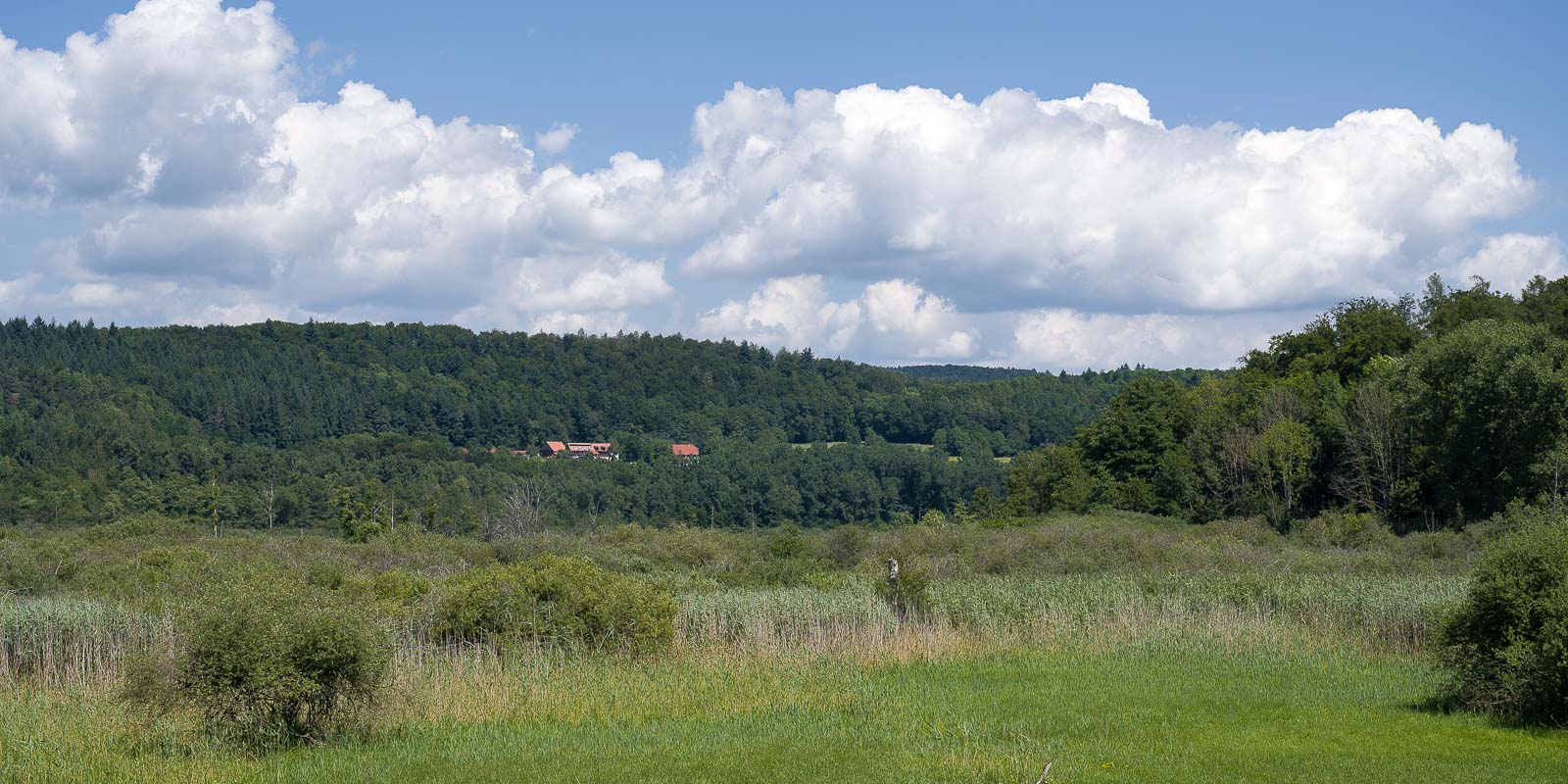 Am See angekommen wurden erst mal einige Seebilder gemacht. Der Weg ging durch den Wald am südlichen Ufer entlang in östlicher Richtung. Dem Anschein nach waren hier überwiegend Einheimische unterwegs. Von den typischen Touris war es nicht so überlaufen. Am Ostufer angekommen, ging es in nördlicher Richtung durch ein Schilfgebiet. Am Nordufer hatten wir zwei Möglichkeiten : a) dem Track des Wanderführers folgend oberhalb des Sees entlang oder b) der Rundweg Beschilderung nach näher am Ufer entlang. Auf eine schöne Aussicht hoffend, entschied ich mich für die obere Variante, auch wenn Petra davon nicht so begeistert war, denn am Anfang ging es schweißtreibend über offenes Feld den Berg hinauf. Aber schon bald erreichten wir den rettenden, schattigen Wald.