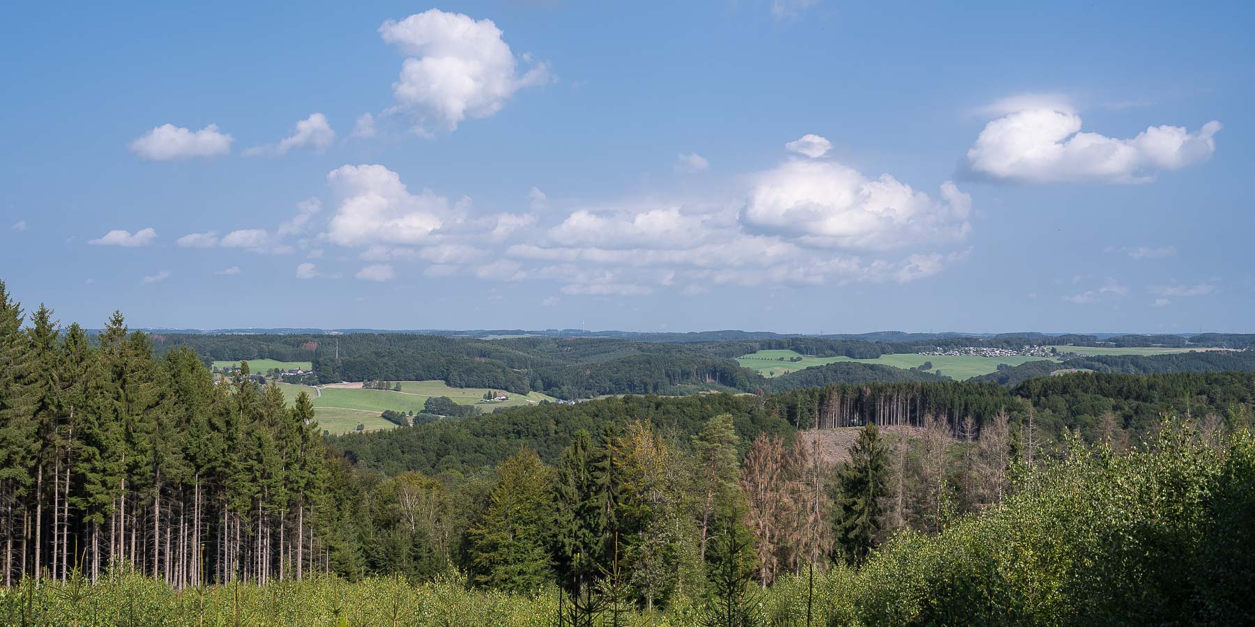 An dem nächsten Abzweig zu einem Steinbruch (dem Steinhauer Pfad) marschierte ich vorbei weiter durch den Wald. Danach kam ich nach Hönighausen, dann gab es wieder Wald und danach kam Brochhagen. Zwischendurch konnte ich schöne Ausblicke über das Bergische Land genießen.