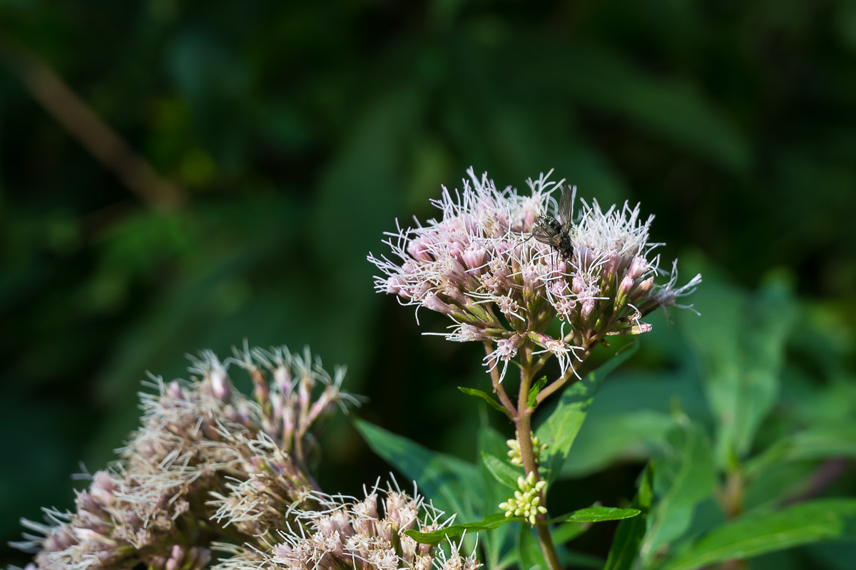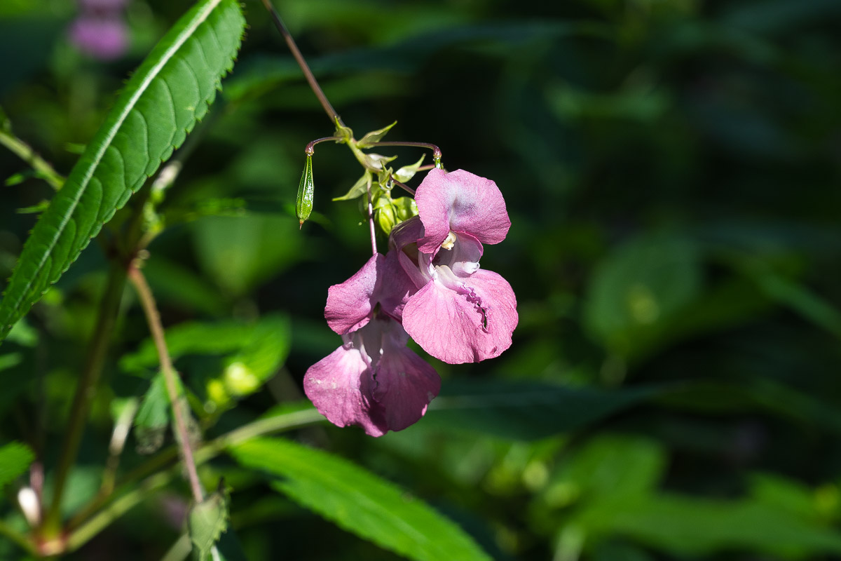 Nach einem kurzen Stück über einen asphaltierten Wirtschaftsweg am Ortsausgang von Kapellensüng kam ich in den Wald. Hier war das Gras auf dem Weg noch recht feucht und ich war wieder mal froh das meine Wanderstiefel wasserdicht sind. Dabei fand ich einiges zum fotografieren : nasses Springkraut und schöne morgendliche Waldwege.