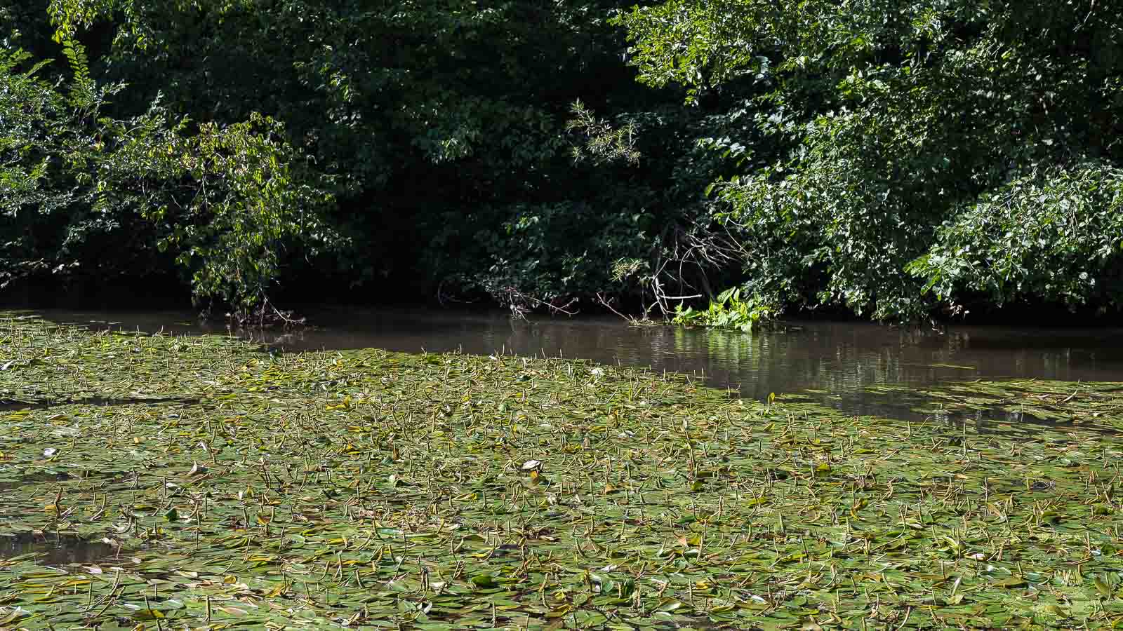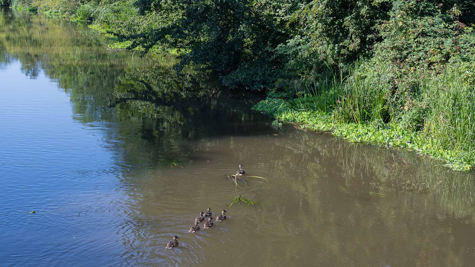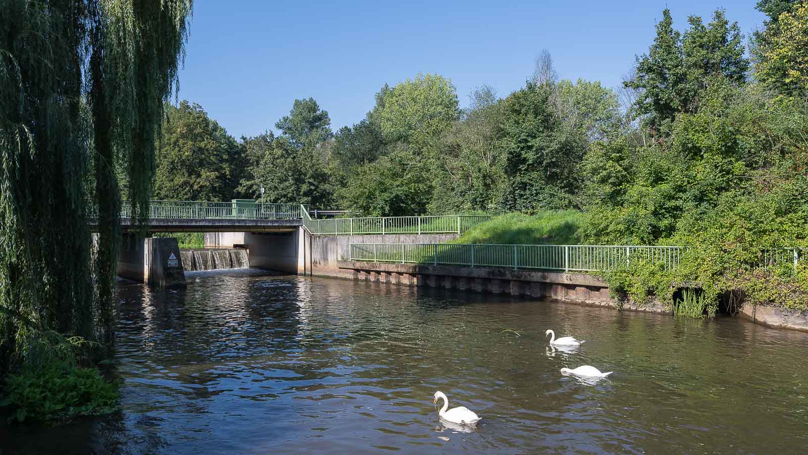 Ganz in der Nähe verläuft die 8,6 km lange Wanderung an der Erft in Grevenbroich. Hier gibt es keine Steigung und die Wege gehen näher am Fluss entlang. Gelaufen im August 2019.