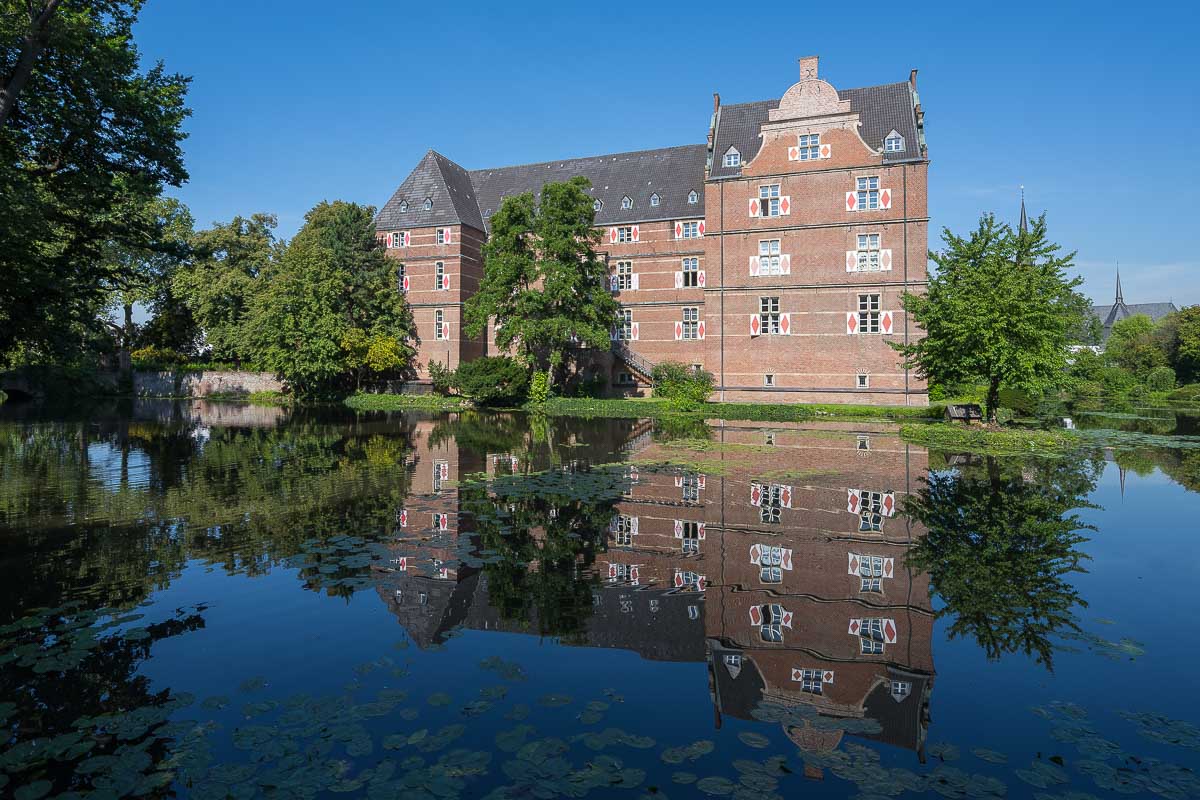 Schloss Bedburg wird halb umschlossen von einem Schlossteich. Es wird auf der Wanderung umrundet. Toll fand ich die Spiegelungen des Schlosses im Teich. Nach dieser sehr schönen Wegstrecke ging es überwiegend entlang der Erft zurück zu meinem Parkplatz.