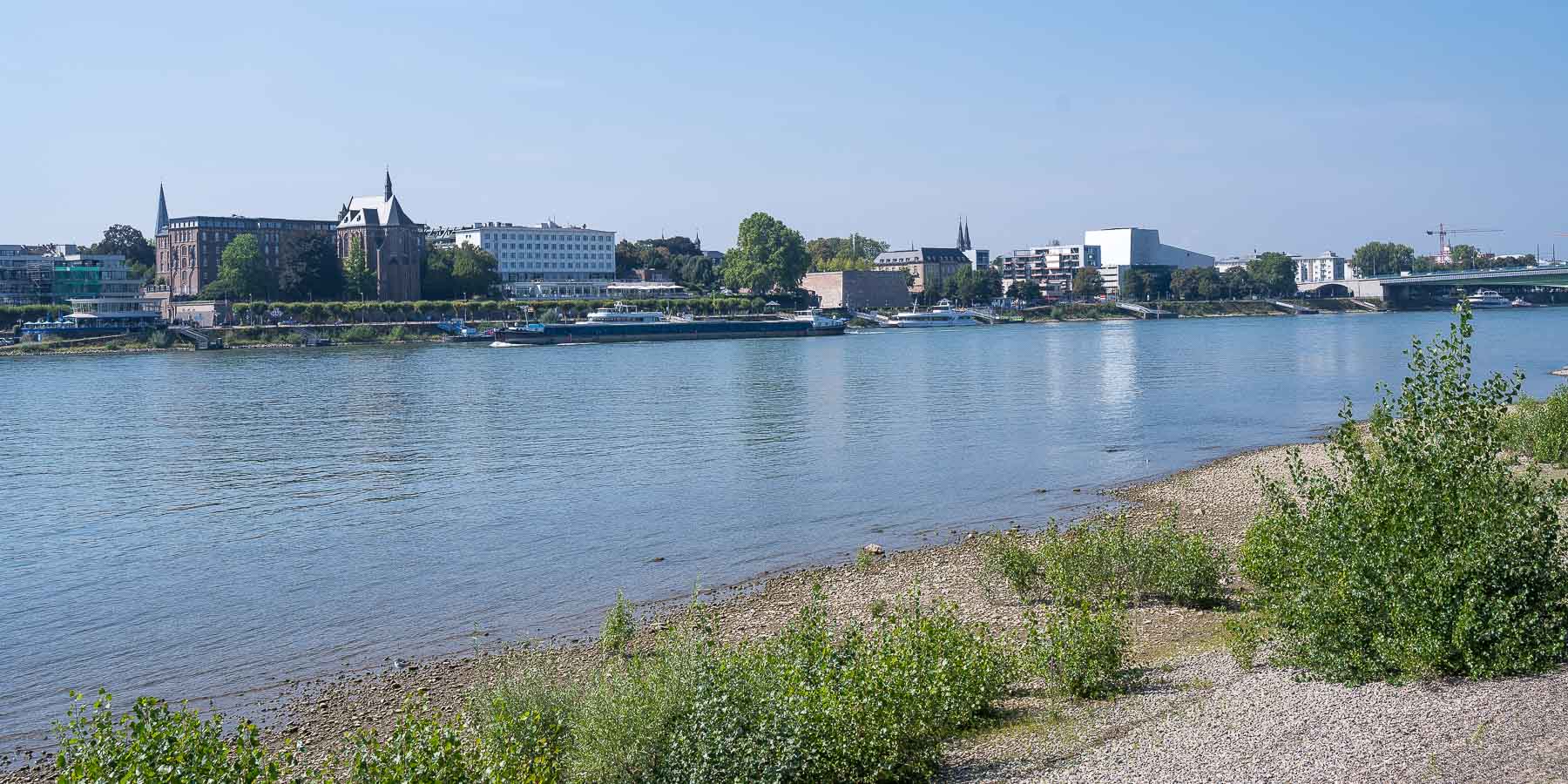 Bevor wir zum Rhein hinab steigen konnten, mußten wir noch die Autobahn A59 überqueren. Der Weg führte dabei eine Zeit lang parallel zur Autobahn. Sehen konnten wir sie dabei nicht, aber um so deutlicher war sie zu hören. Hinter der Autobahn liefen wir durch Wohngegend hindurch bis zum Rhein. Dort unten angekommen machten wir erst mal ein kleines Päuschen und verzehrten unseren Marschproviant.