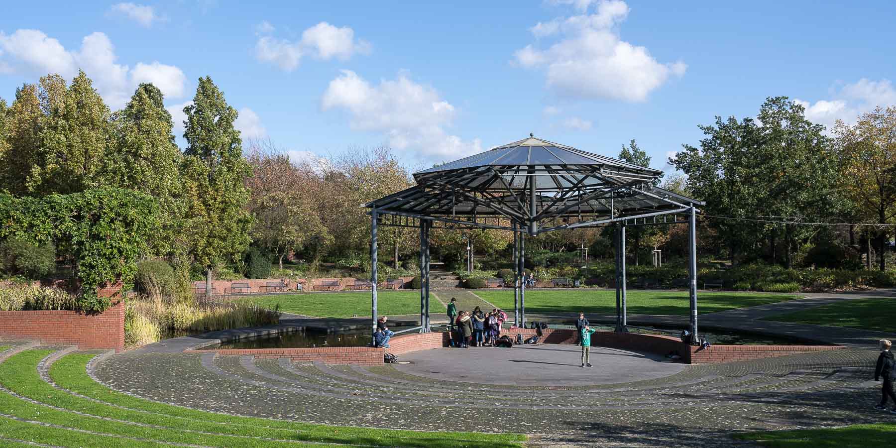 So wanderten wir durch den Park an Schloss Broich vorbei in Richtung Stadthalle zur Ruhr, die wir auf der Schlossbrücke überquerten. Die Aussicht von der Brücke hat uns beiden sehr gefallen.
