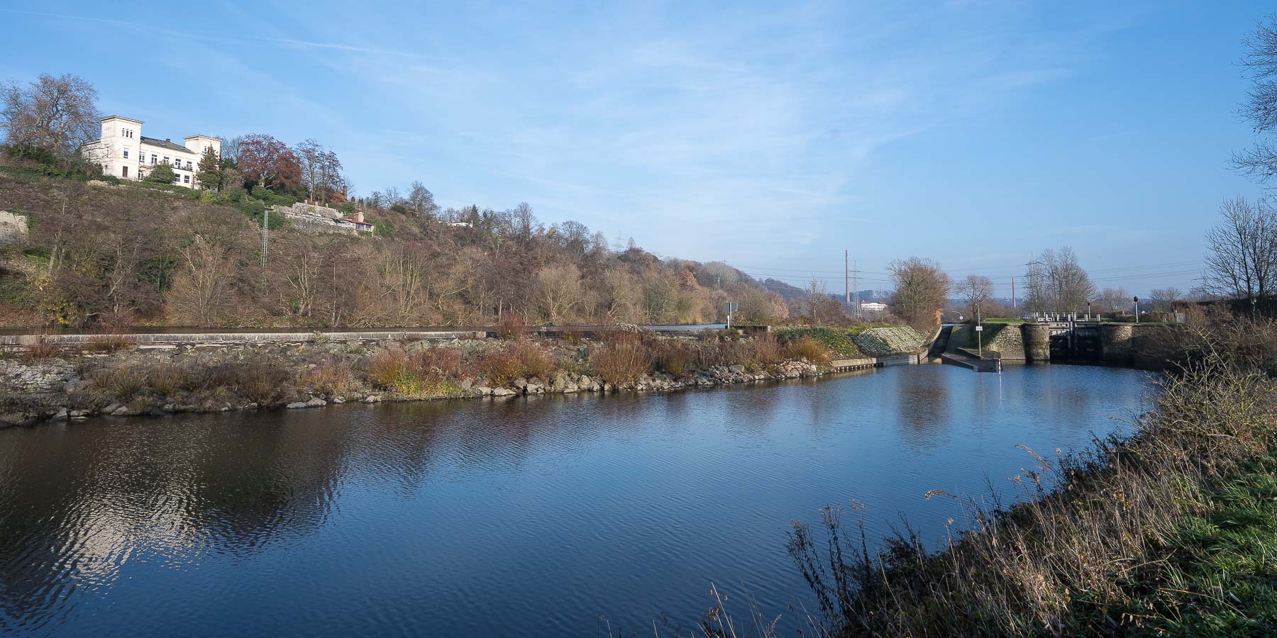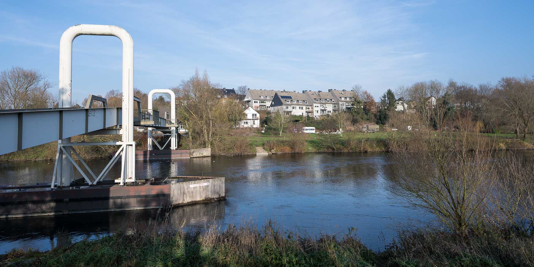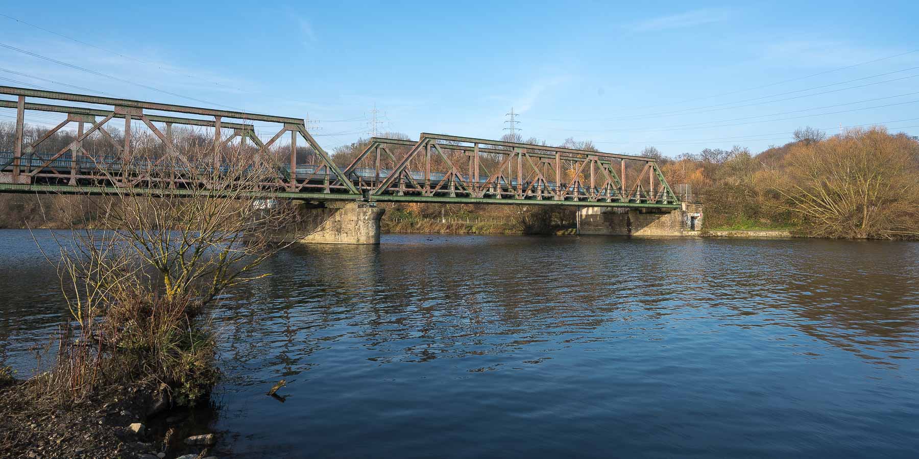 Nach etwa 3 km unterquerten wir eine ehemaligen Bahnbrücke. Die hatte den Krieg wohl nicht ganz schadlos überstanden und war mittlerweile stillgelegt. Nebendran hatte man eine Fußgängerbrücke gebaut. Hinter der Brücke erreichten wir dann das Horster Wehr. Hier ist die Ruhr gestaut und es wird Strom erzeugt der früher in einer am Ufer gelegenen Karbidfabrik benutzt wurde.