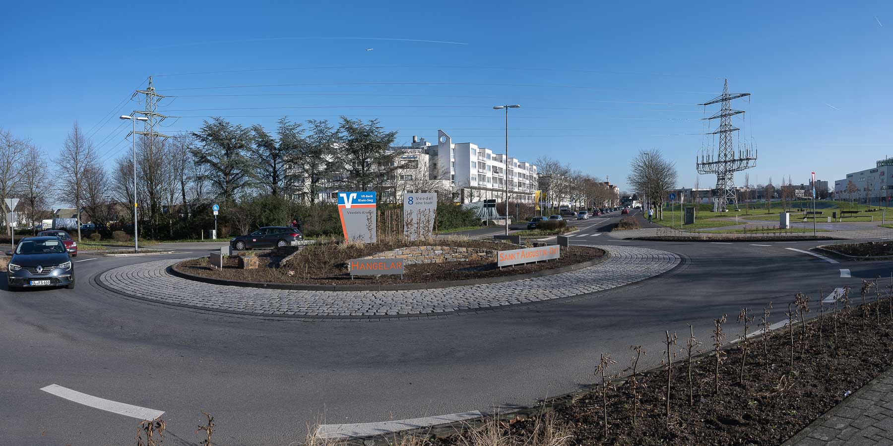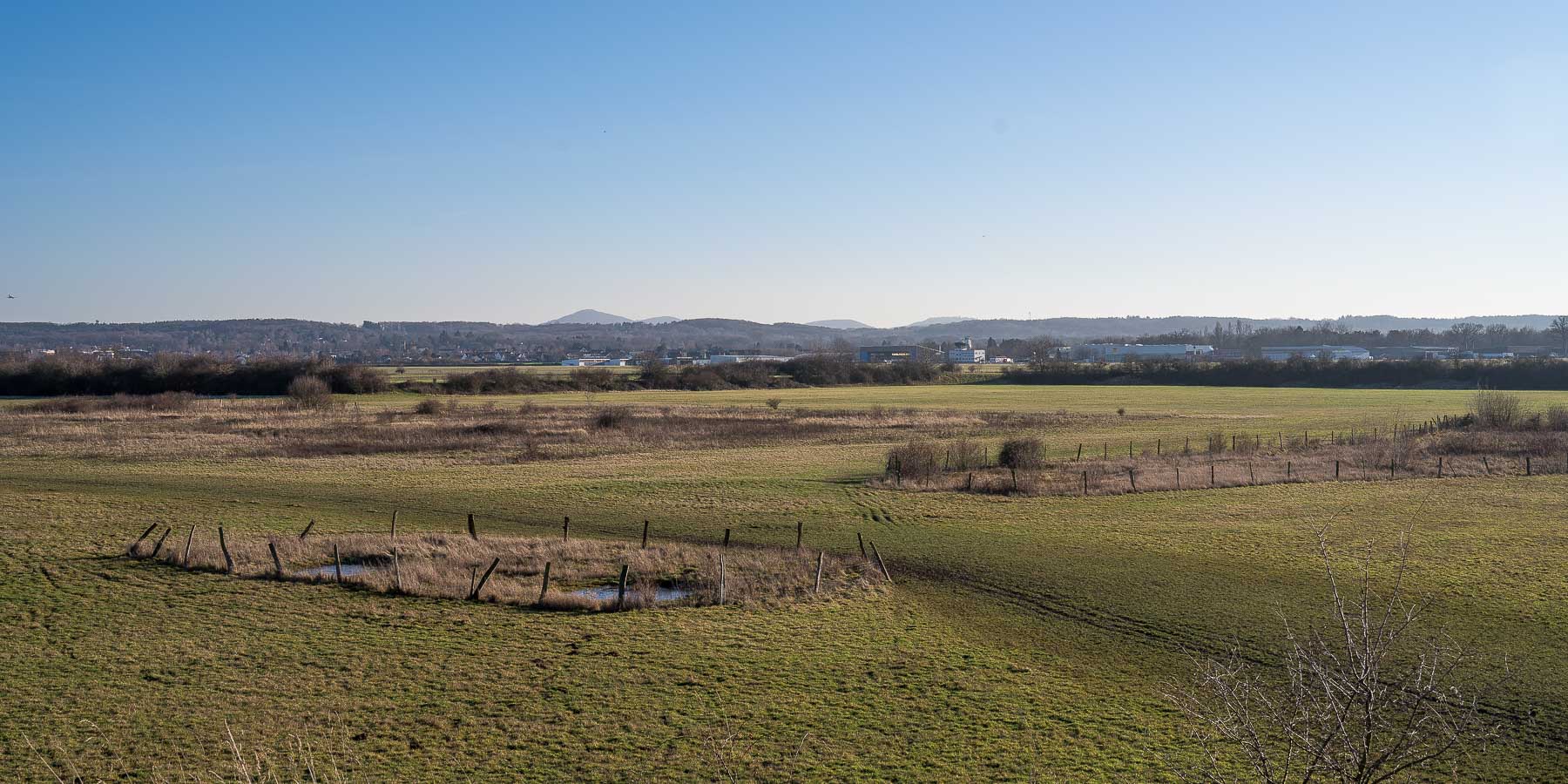 Es dauerte dann auch etwas bis wir den Ausgang des Einkaufszentrums gefunden hatten. Danach müßten wir dann eine ganze Weile durch Stadtgebiet / Gewerbegebiet wandern bis wir das offene Feld erreichten. Entschädigt wurden wir durch das tolle Wetter mit einem seit langem nicht mehr erlebten Fernblick.