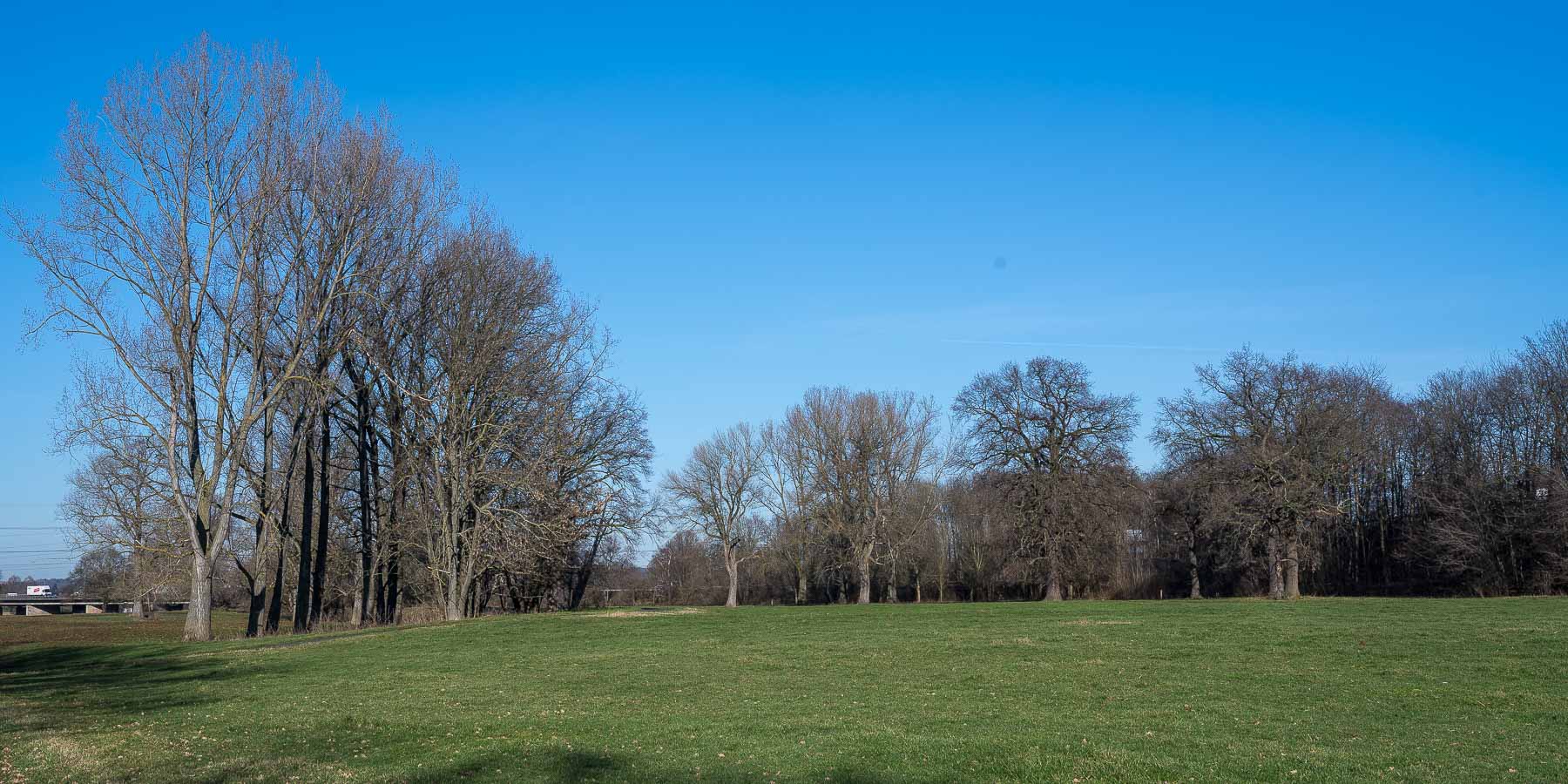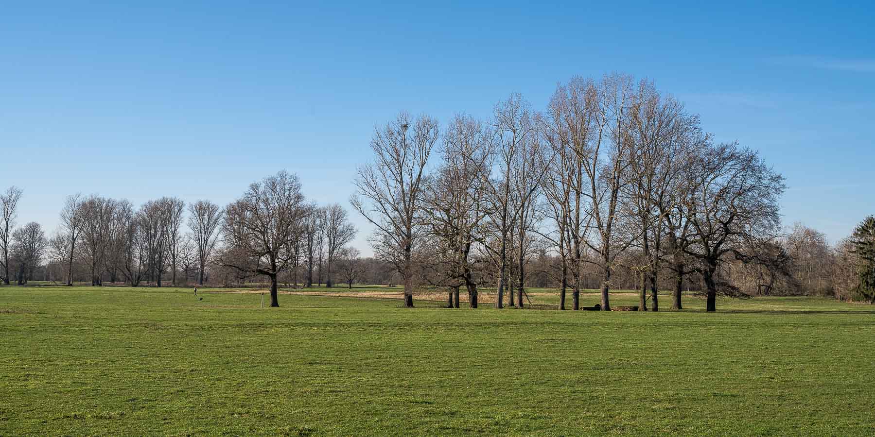Irgendwann hatte die Herde ihre neue Weide erreicht und verließ den Fahrweg, wir hingegen zogen weiter durch die Siegauen. Kurz vor Meinden kamen wir direkt an der Sieg vorbei, die gut gefüllt dem Rhein entgegen floß. Anschließend unterquerten wir erneut eine Autobahn und eine Bahnlinie und gelangten in die Hangelarer Heide. Hier hatten wir eine schöne Aussicht auf die Ausläufer des Siebengebirges.