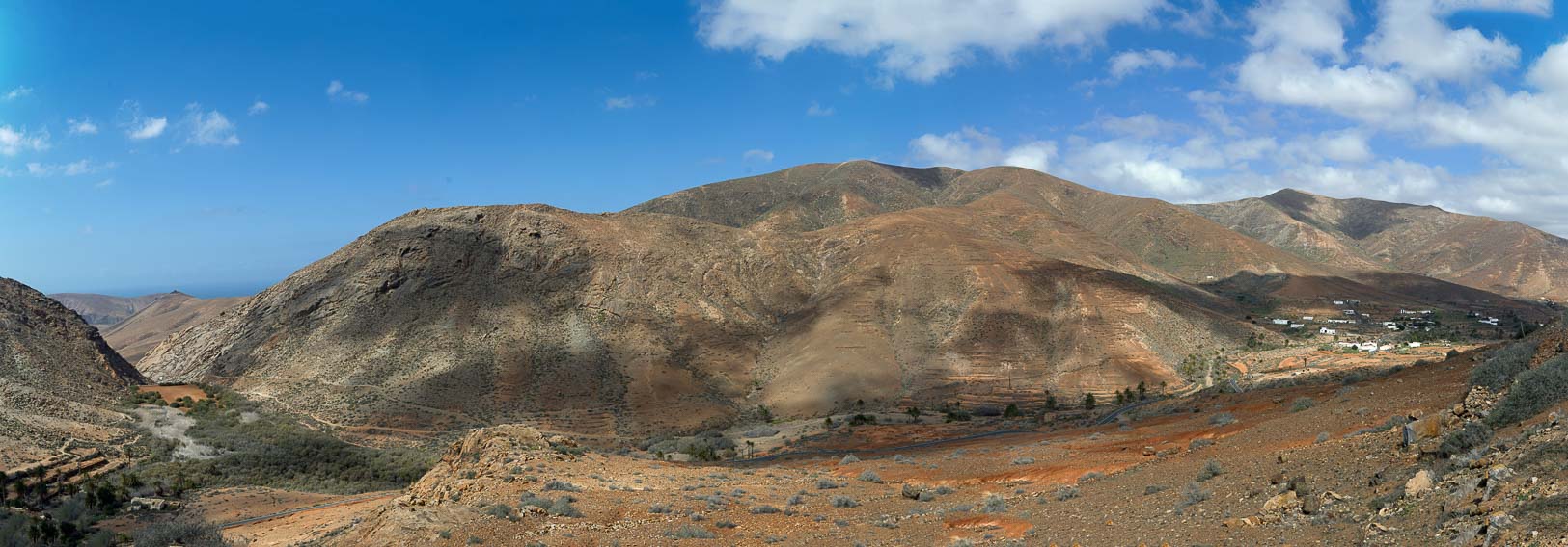 In dem Rother Führer wird diese Wanderung als TOP hervorgehoben (Nr. 14). Die Anfahrt aus Costa Calma ist kurz, aber besonders auf der FV30 hinter Pajara doch recht kurvenreich. Unterwegs kommt man am Mirador de Fenduca vorbei. Von hier aus kann man das Tal in dem die Wanderung stattfindet gut überblicken. Auf der Rückfahrt machten wir hier kurz Halt und ich machte ein Panoramafoto.