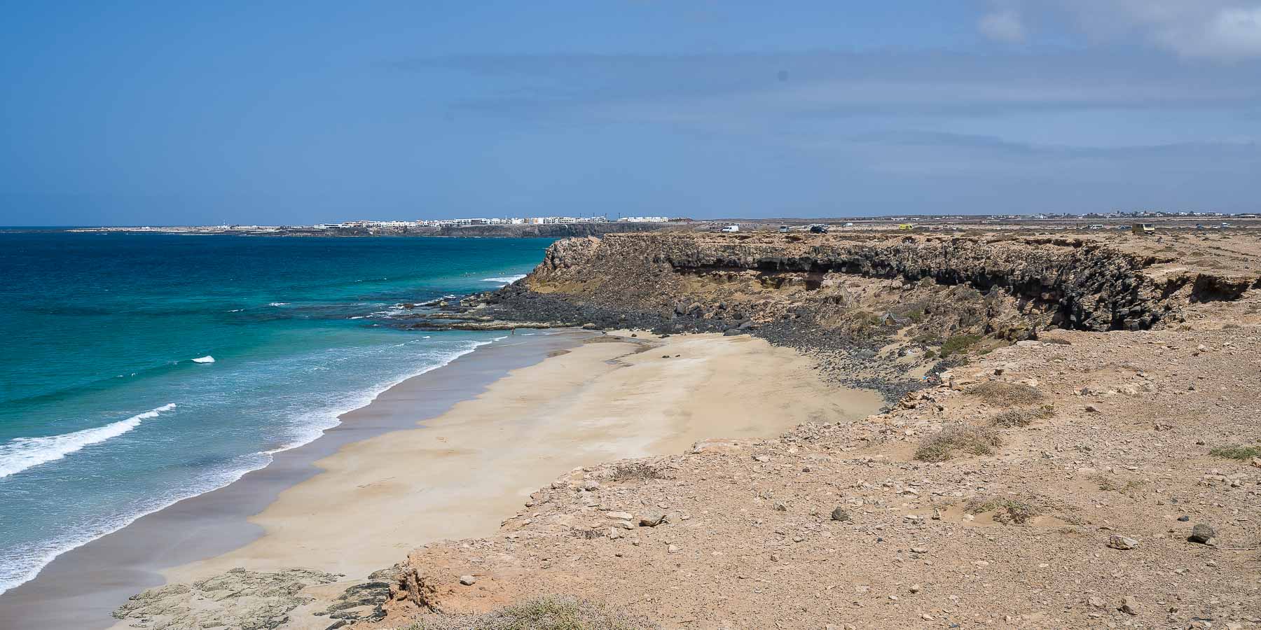 Nach knapp 7 km kamen wir am Playa Esquinzo an. Hier gab es einen, nur per Schotterpiste erreichbaren, Parkplatz der ausschließlich von Surfern bevölkert wurde. Den Strand selbst fanden wir im Vergleich zu den bisher passierten eher nicht so dolle, so daß wir auf einen Abstieg verzichteten.