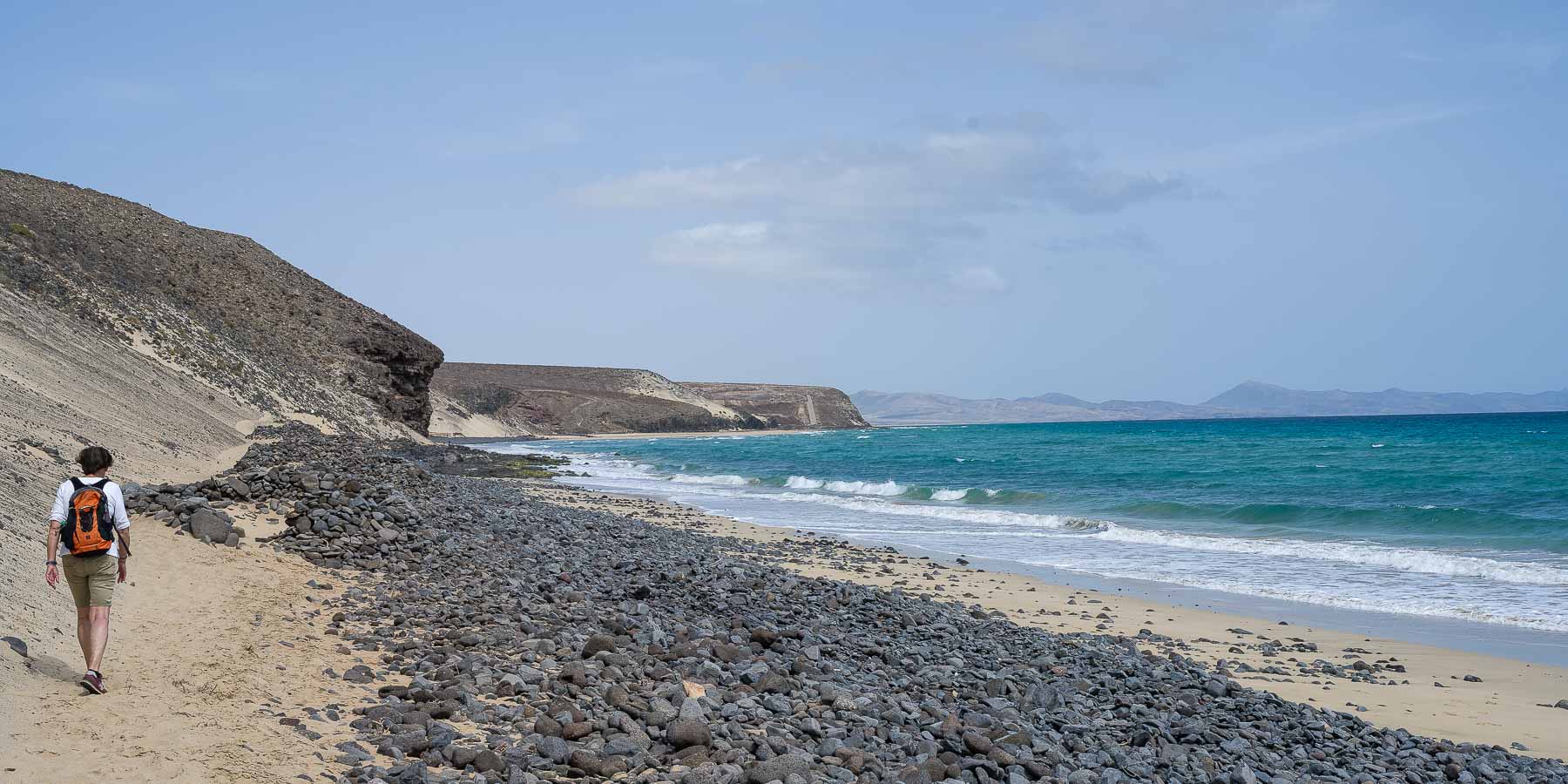 Die Strandwanderung von Jandia Playa zur Playa Barca gilt als die Strandwanderung auf Fuerteventura schlechthin. „Eine Strandwanderung wie sie von den Kanarischen Inseln nur Fuerteventura bieten kann!“, sagt zumindest unser Rother Wanderführer in der Beschreibung der Wanderung Nr. 25.
