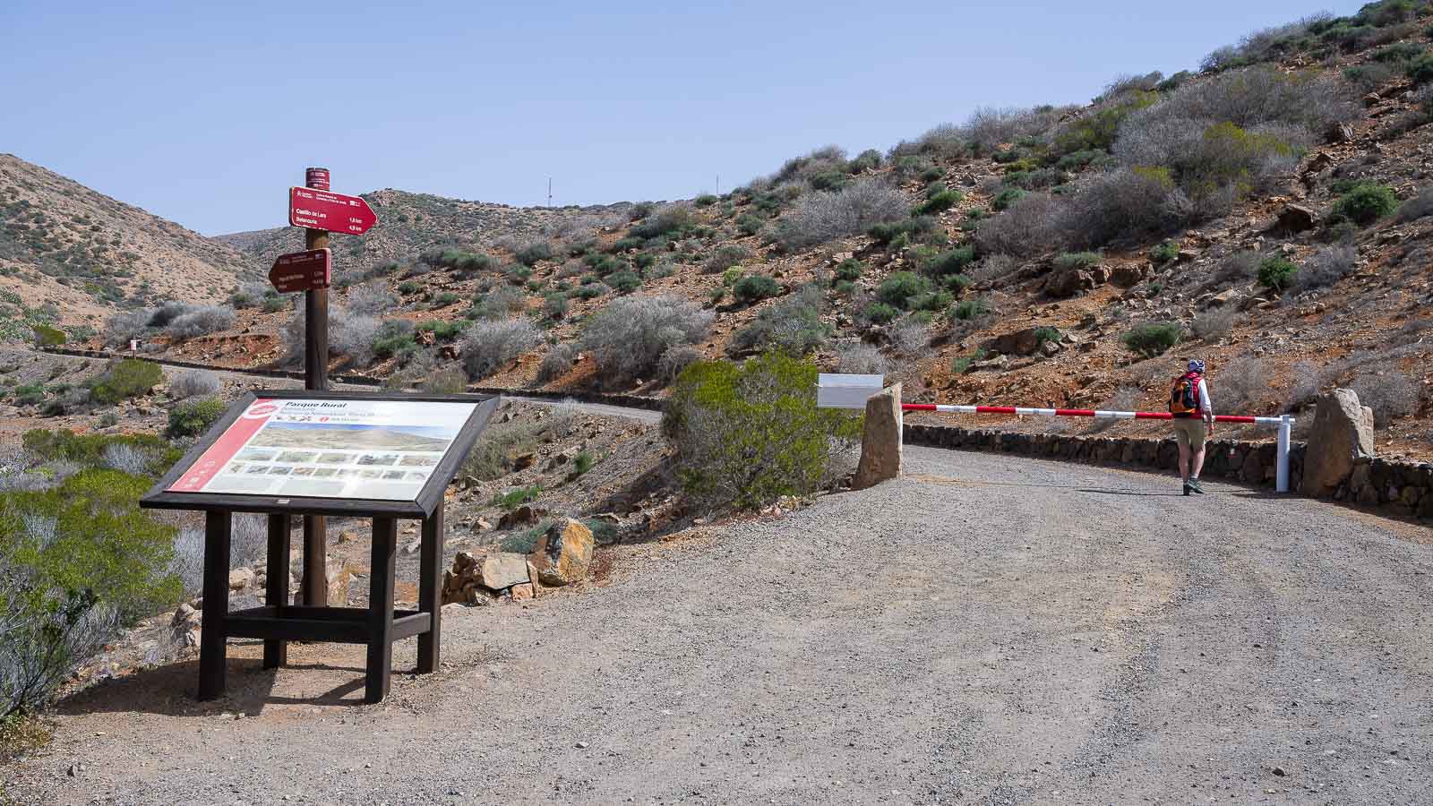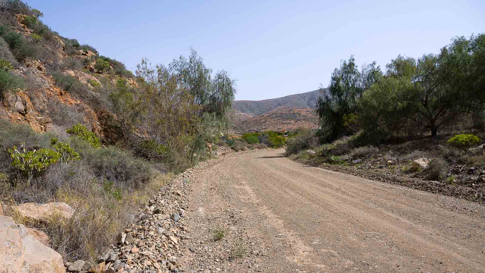 Der erste Teil der Wegstrecke war für eine Wanderung echt seltsam. Es ging über eine sehr breite Piste etwas unterhalb der Strasse entlang. Der Weg sah aus als hätte man ihn für einen späteren Strassenneubau hergerichtet. So waren wir froh als wir nach ca. 1 km rechts ab in einen kleinen Barranco abbiegen konnten. Mittels eines Tunnels unterquerten wir die FV30 und gelangten auf einen breiten Weg der uns taleinwärts führte. Wer die Wanderung machen möchte parkt am besten hier, gleich an der Abzweigung von der Strasse.