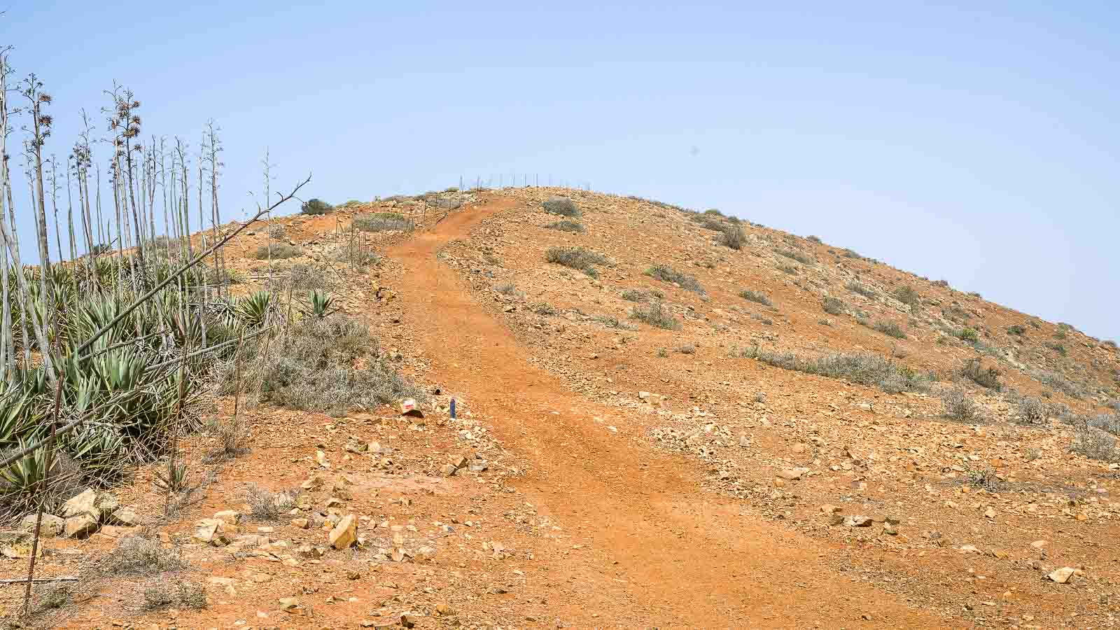 Von dem Rastplatz wanderten wir bis zum Degollada del Marrubio. So heißt die Passhöhe auf dem Bergkamm. Je höher wir kamen um so stärker blies uns der Wind entgegen, auch die Aussicht in das gegenüberliegende Tal von Antigua war recht diesig. Vor allem wegen des Windes verzichteten wir auf die letzten Höhenmeter zum Morro del Cortijo und traten von der Passhöhe aus den sofortigen Rückzug an.