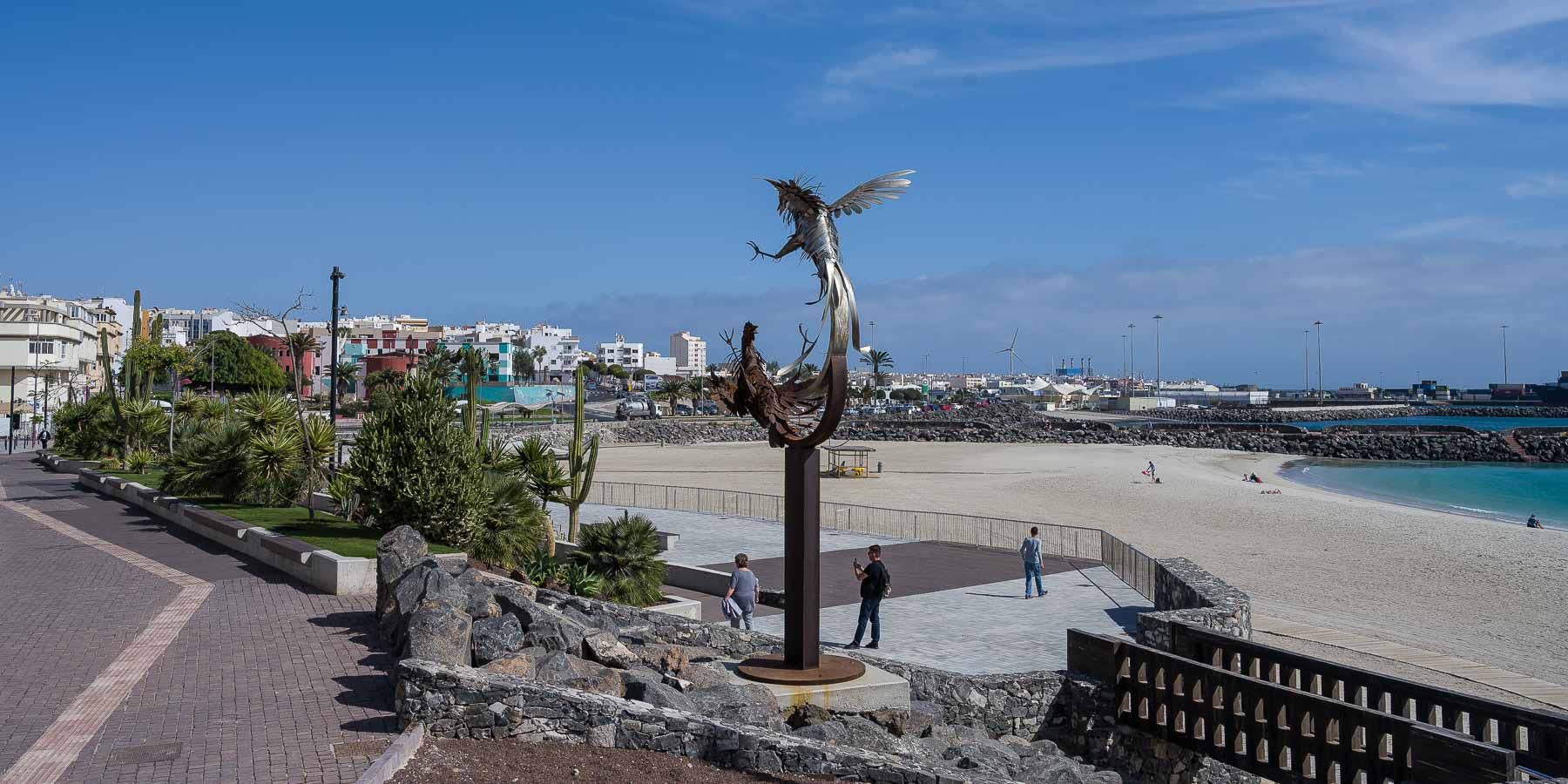 Gefallen hat uns die schöne Aussicht auf die vorgelagerte Insel Lobo mit Lanzarote im Hintergrund. Auch die Fischfiguren am Hafen waren ganz nett, ebenso der Strandkünstler mit seinen Bauwerken aus Sand.
