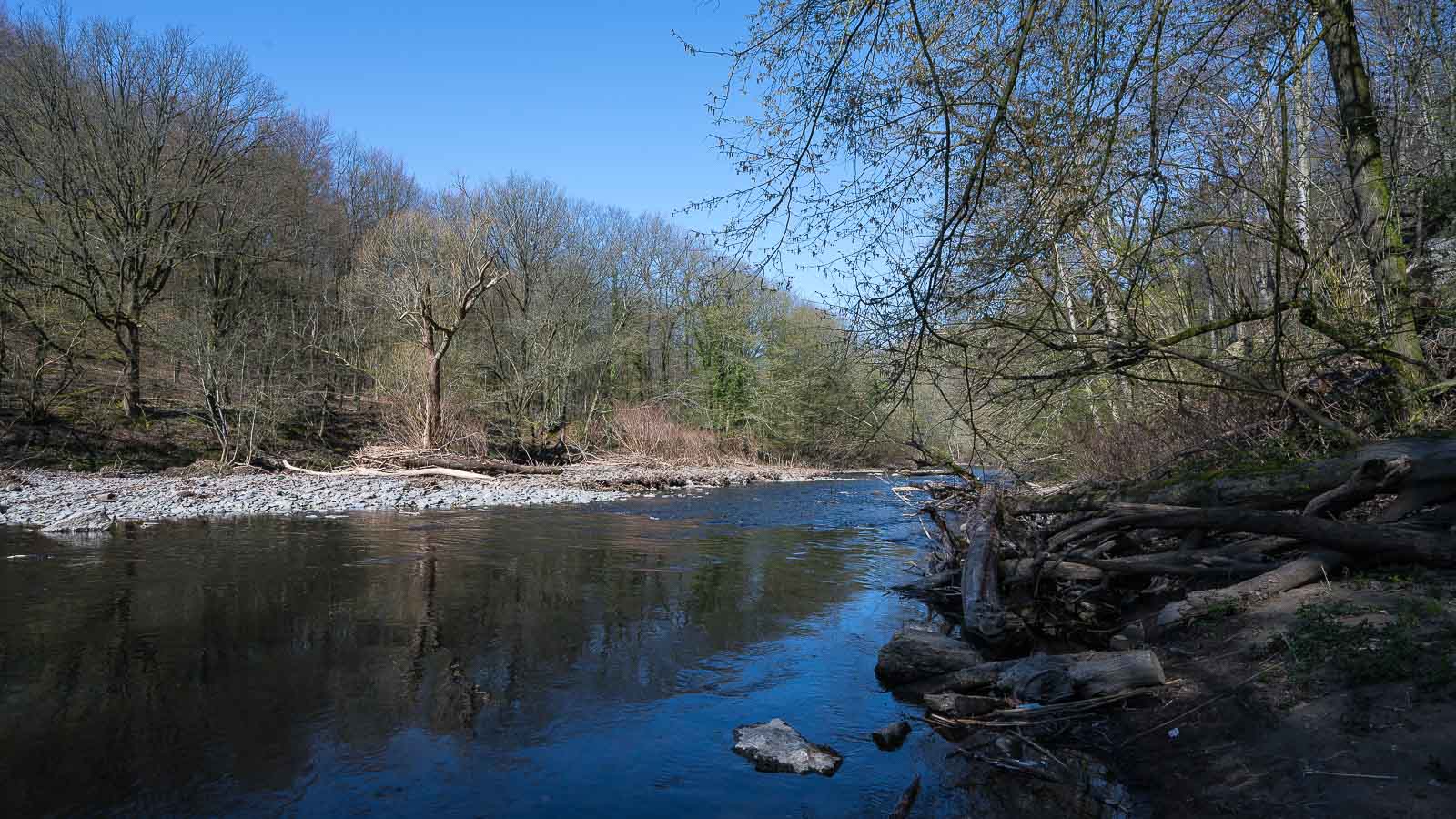 Dabei geht es zunächst in Flußnähe der Wupper entlang. Aber schon bald steigt der Weg etwas an und verläuft durch den morgendlichen Wald. Da dieser zur Zeit noch recht licht ist, hatte ich eine schöne Aussicht auf die Wupper und die gegenüberliegenden Hänge.