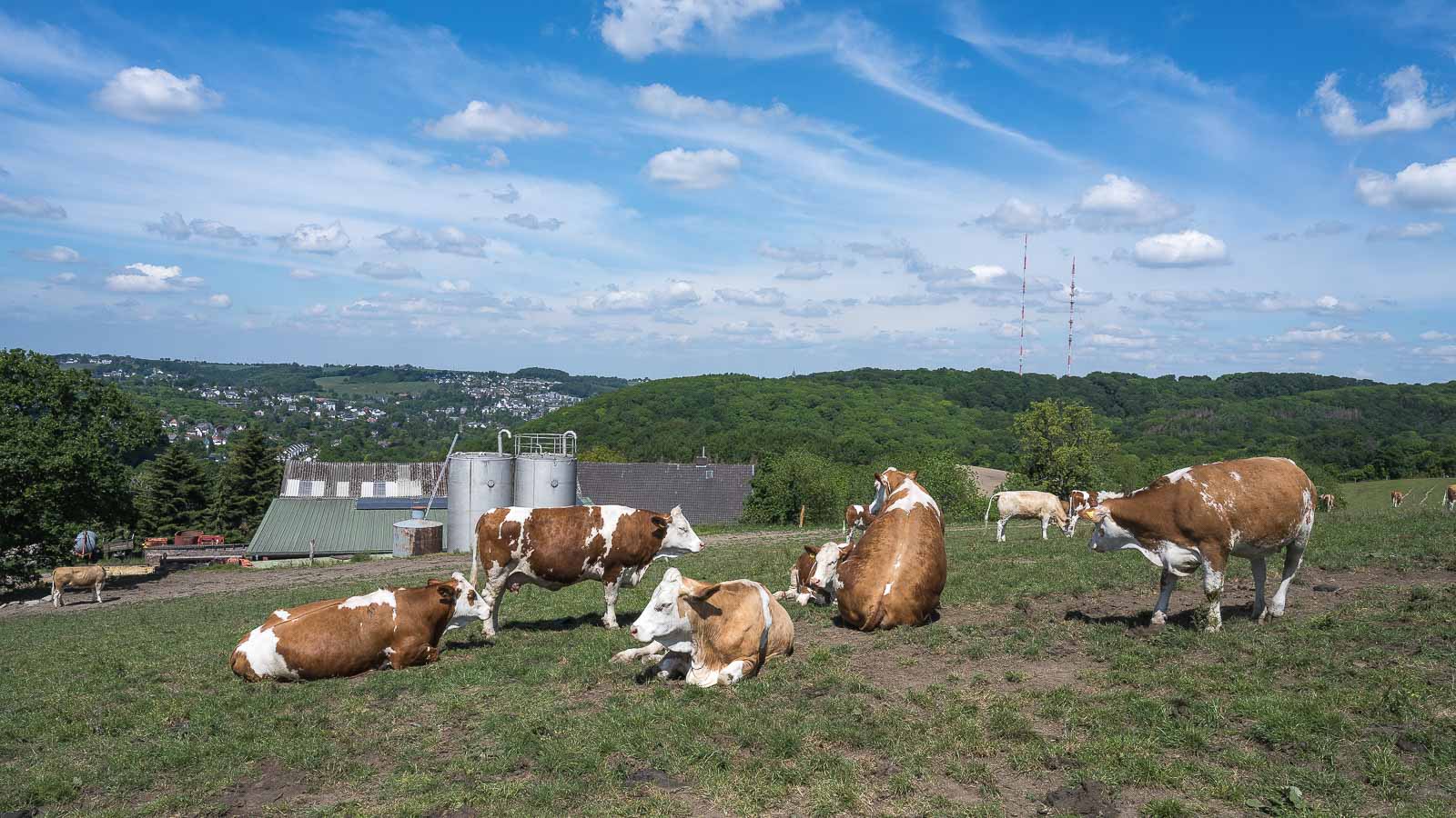 Wir parkten am Parkplatz des Nizzabades, dieses ist bei Google-Maps als Zielpunkt bekannt. Dort dürfte man immer ein Plätzchen bekommen, auch wenn er heute am Sonntag schon recht gut belegt war. Wir folgten dem Track in Richtung Stumpes, einer auf dem Berg gelegenen Hofschaft. Von dort hatten wir eine tolle Aussicht über die Bergische Hügellandschaft.