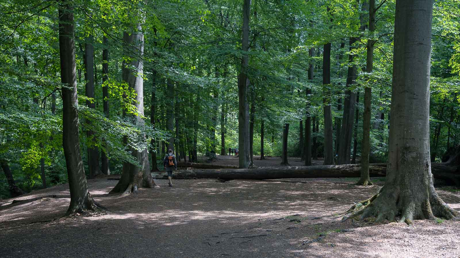 Nach etwa 2 km Wanderung erreichten wir den Rotbach. Dieser mäandert sich durch flaches Gelände. Links und rechts des Baches gibt es lichte Buchenwälder. Da die Gegend schon seit 1926 unter Naturschutz steht, blieben umgefallene Bäume schon lange einfach liegen. Ich fand es beeindruckend diese gefällten Riesen mit ihren bis zu 4 Meter hoch aufragenden Wurzeln und dem daran hängenden Erdreich liegen zu sehen. Petra meinte zu recht : „Da hängt ja noch der ganze Fussboden dran !“