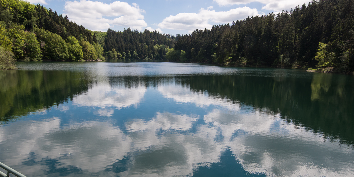 Nach der schönen Aussicht auf Schloss Burg ging es bald wieder bergab Richtung See. Dieser lugte aber nur gelegentlich zwischen den Bäumen hervor, runter an den See darf man nicht da das Gelände als Trinkwasserschutzgebiet eingestuft ist. Auch heute noch bezieht die Stadt Solingen ihr Trinkwasser aus der Talsperre.