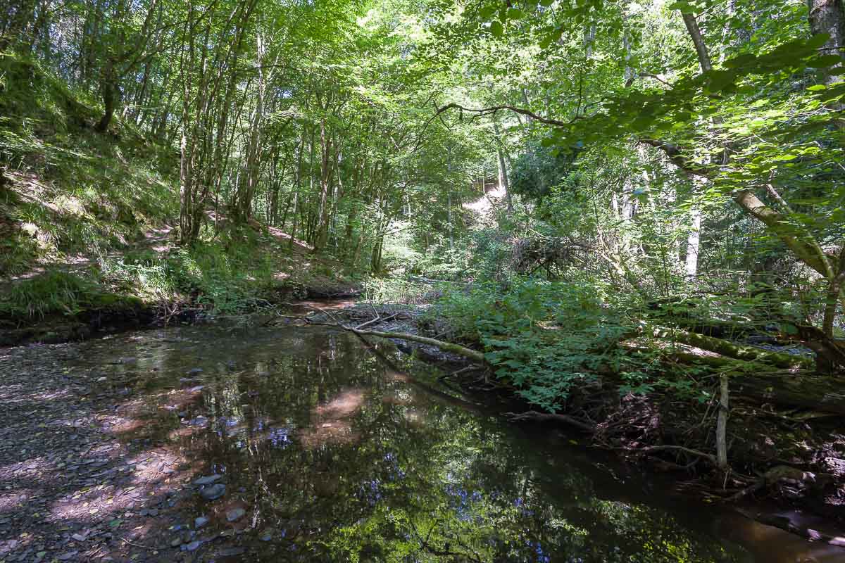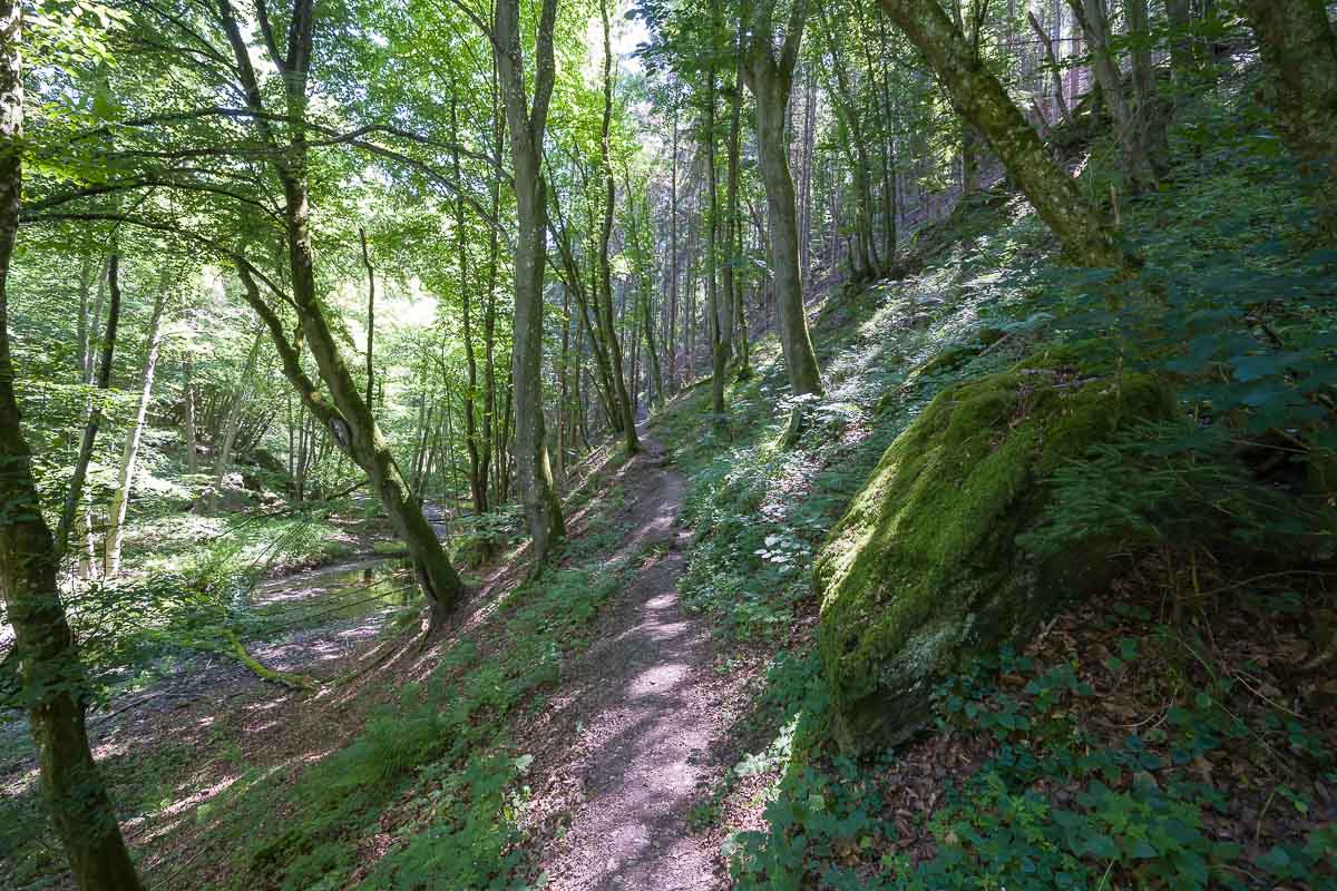 Etwas enttäuscht starteten wir den Abstieg in das Baybachtal. Unterwegs kamen wir dann noch an älteren, verfallenen Teilen der Burg vorbei. Hier stapften wir etwas herum, viel zu sehen gab es aber nicht. Nach einem weiterem, kurzem Abstieg kamen wir im Tal an. Dieses war meist durchgehend bewaldet. Wegen der langsam steigenden Temperaturen kam uns dies entgegen, konnten wir doch für fast 4 Kilometer im schattigem Talgrund bis zur Schmausemühle wandern.