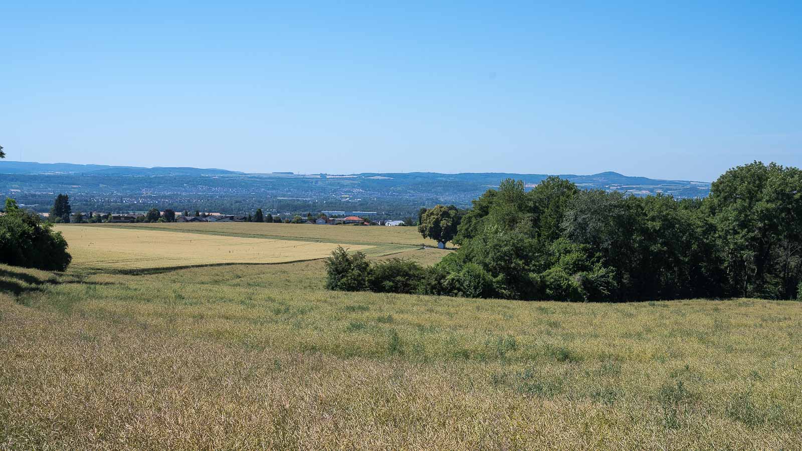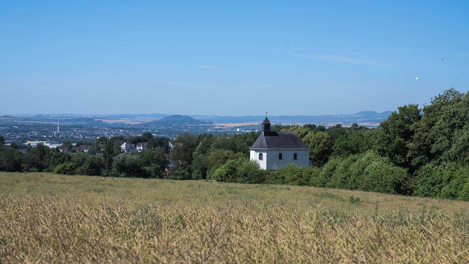 Nach einem kurzen Wegstück im Wald erreichten wir bald offenes Gelände mit toller Aussicht über das Neuwieder Becken. Unterwegs war hier niemand. Schon bald machten wir einen kleinen „Sidestep“ um uns eine schon von weitem sichtbare Kapelle anzuschauen. Die Klosterkirche St. Peter und Wülverberg gehörte mal zu einem Annexkloster von Rommersdorf. In den 80-Jahren des letzten Jahrhunderts war sie umfassend renoviert worden. Und wenn nicht Corona wäre, so hätten wir sie uns auch von innen anschauen können. Jetzt aber mußten wir nach einer kurzen Aussenansicht weiter ziehen.