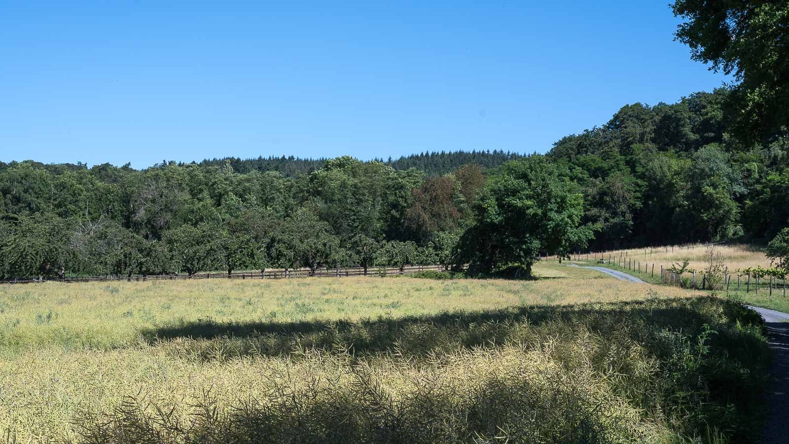 Nach unser Besichtigungsrunde liefen wir wieder zurück zum Engelstor und wanderten von dort weiter in Richtung Wald. Als wir diesen erreichten bogen wir links ab und wanderten zunächst am Waldrand entlang. Der Weg war nur wenig begangen und daher recht zugewachsen. Entsprechend der Jahreszeit gab es reichlich Brennesseln. Dabei war ich mit meinen langen Hosen besser bedient als Petra deren Waden doch etwas abbekamen. Unterwegs kamen wir noch an einer Schafsherde vorbei die hier ihren Unterstand hatte. Zahlreiche Lämmer liefen blökend davon als sie uns kommen sahen.