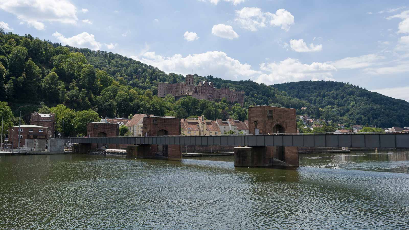 Am Ende des Philosophenweges führte uns die Route in den Wald durch den wir wieder hinab zum Neckar stiegen. Alles auf breiten, bequemen Wegen. Am Wasserkraftwerk Karlstor erreichten wir den Fluss und liefen ein kurzes Stück flussabwärts um die Alte Brücke zu überqueren. Dies war heute ohne Gedränge möglich, es waren nur wenige Touristen unterwegs. Durch das Brückentor erreichten wir die Altstadt.